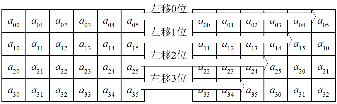 过程:将状态矩阵的第 0 行保持不变,第 1 行循环左移 1 个字节,第 2 行循环左移 2 个字节,第 3 行循环左移 3 个字节。