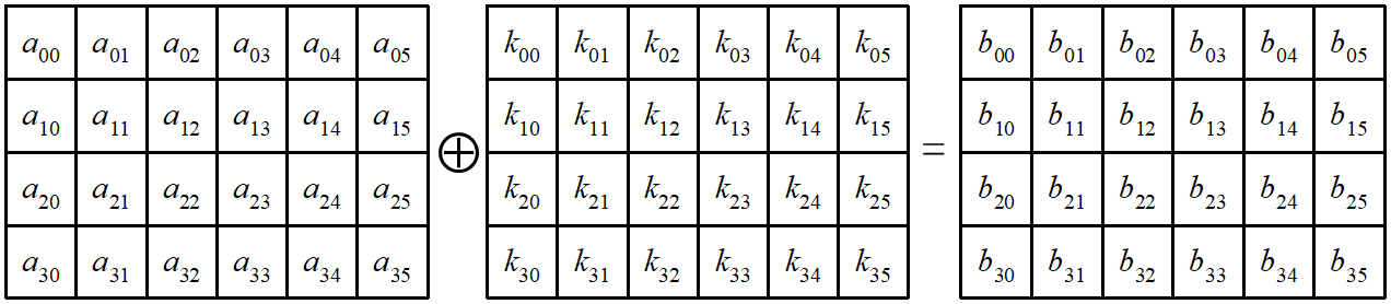 过程:将状态矩阵和轮密钥矩阵的对应元素进行异或运算。