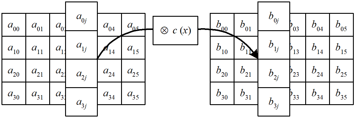 c(x)是与x4+1互素的,因此是模x4+1可逆的。列混合运算也可写为矩阵乘法。设b(x)= c(x) a(x),则