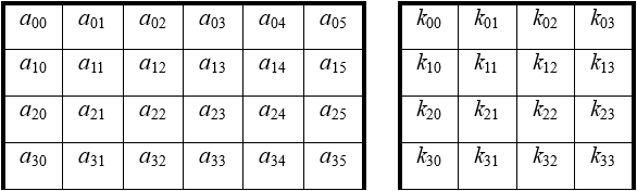 种子密钥类似地用一个以字节为元素的矩阵阵列表示,该阵列有4行,列数记为Nk,Nk等于分组长度除以32。下图是Nb=6的状态和Nk=4的种子密钥的矩阵阵列表示。