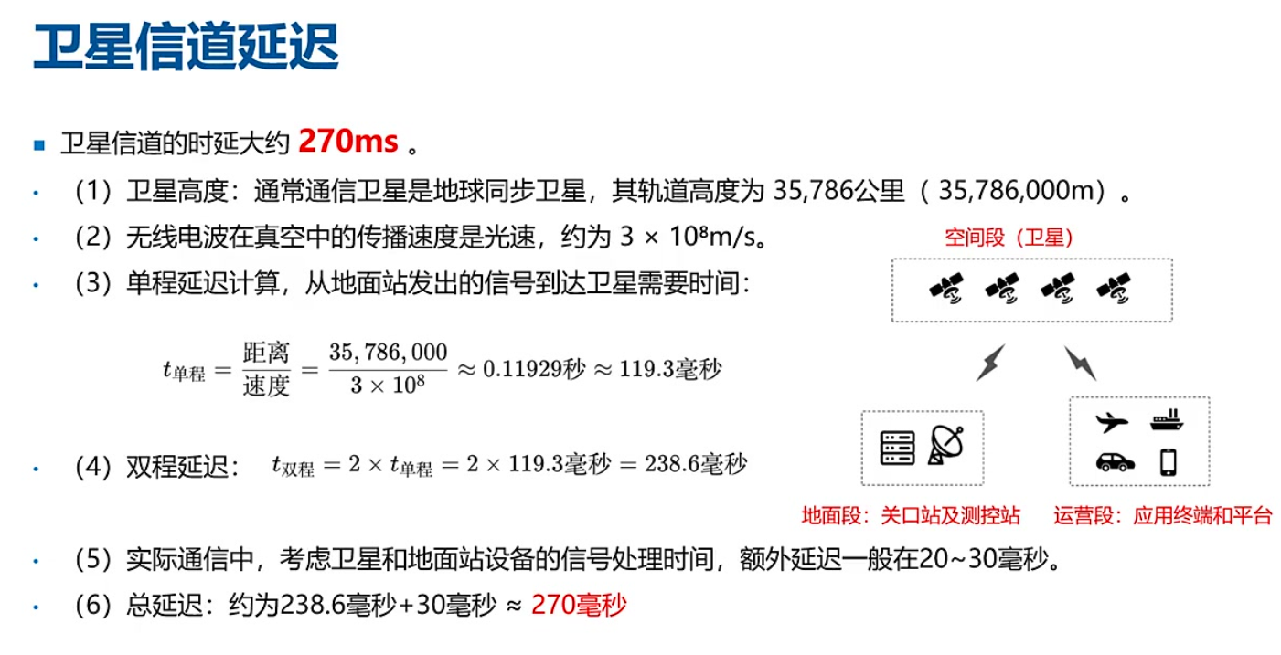 卫星信道延迟 | 地球同步卫星单程延迟约120毫秒 | 低轨卫星(如心链)延迟显著降低 | 中 |