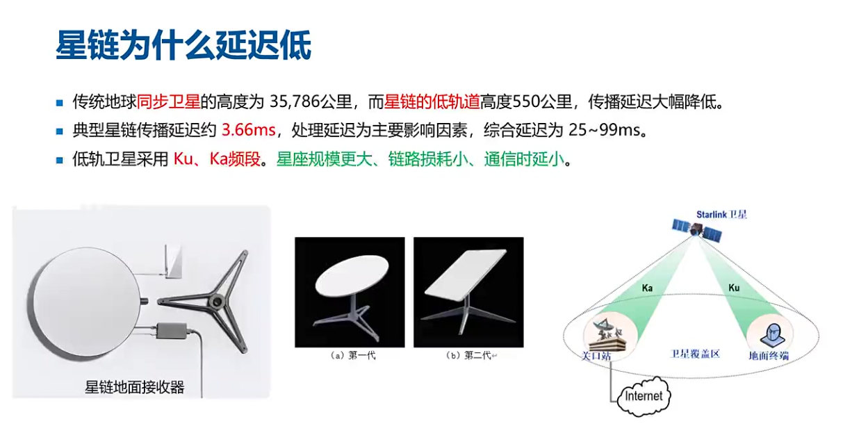 低轨卫星 | 高度约500多公里,覆盖需更多卫星 | 频段采用ku和ka | 中 |