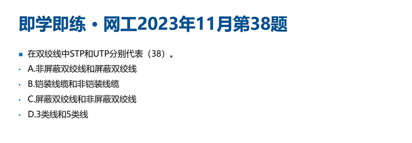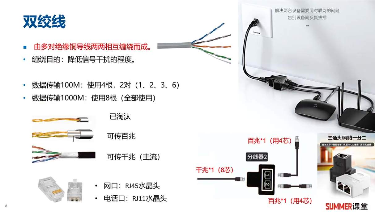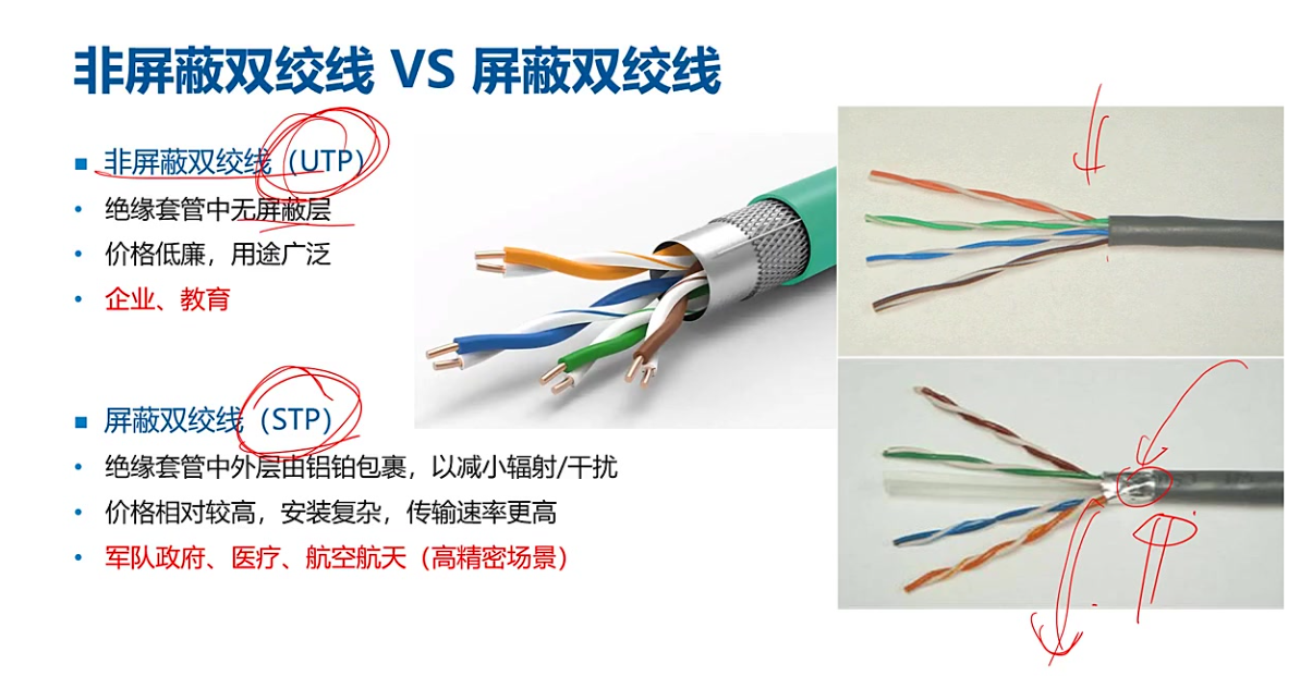 双绞线 | 多对绝缘导线相互缠绕 | UTP与STP区别、网线规格 | 中 |