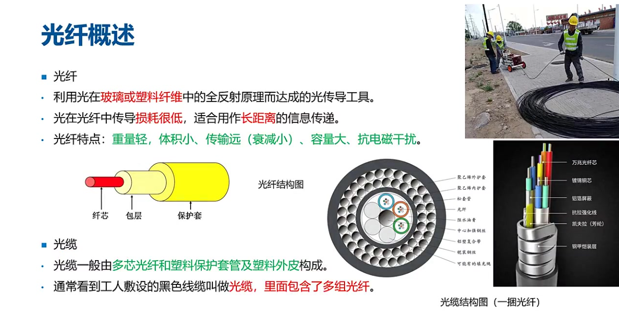 光纤特点 | 重量轻、体积小、传输远 | 光纤与铜缆对比 | 中 |
