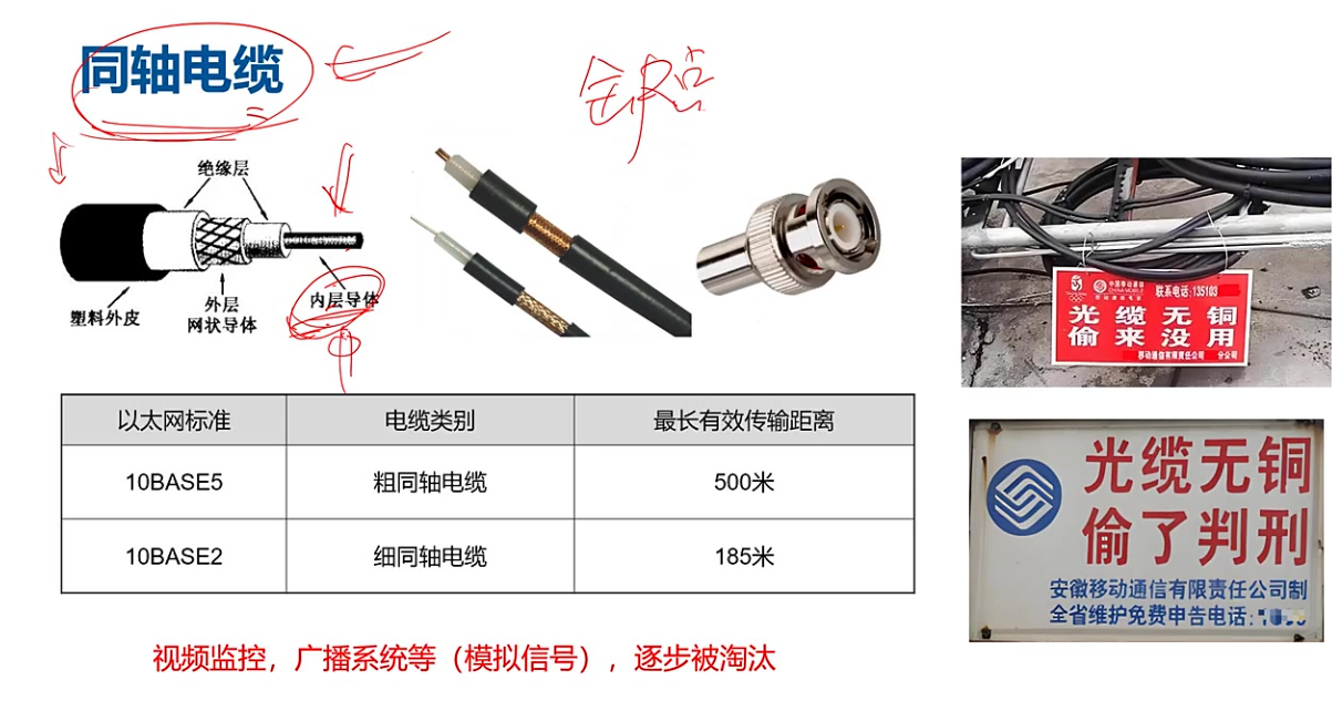 同轴电缆 | 早期以太网使用 | 施工麻烦、成本高 | 中 |