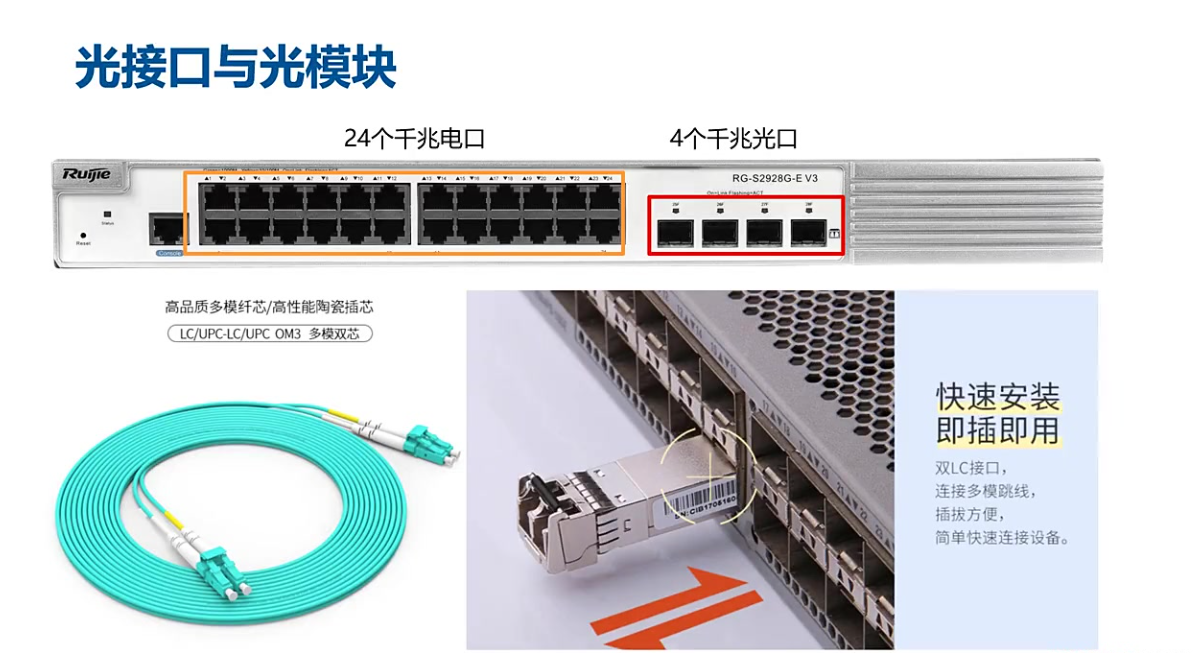 注意: 单模光纤与单模光模块配合使用,多模光纤与多模光模块配合使用,两者不能混合使用。
