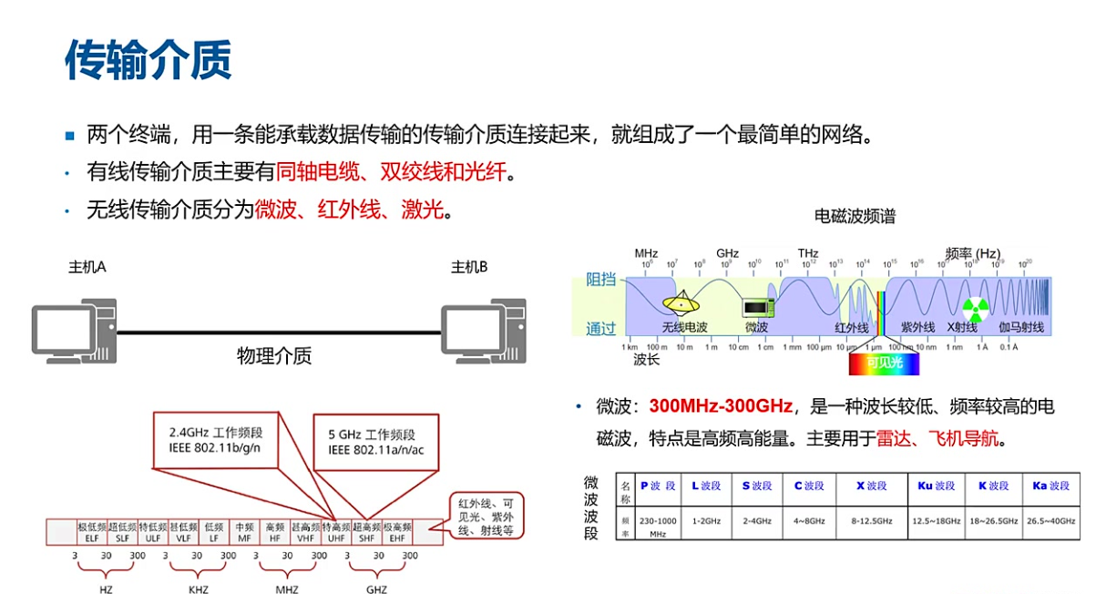 无线传输介质 | 微波、红外、激光 | 微波频率范围、WIFI频段 | 中 |