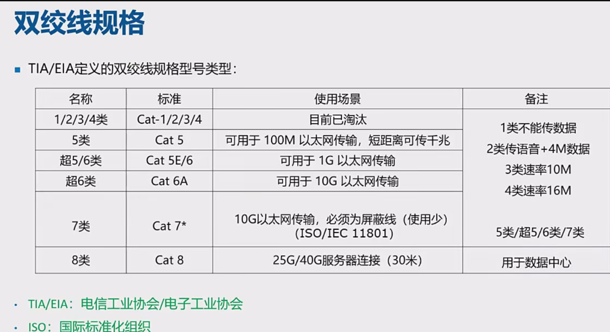 标准制定: 主要由TIA/EIA(电信工业协会/电子工业协会)定义,7类由ISO(国际标准化组织)规定。