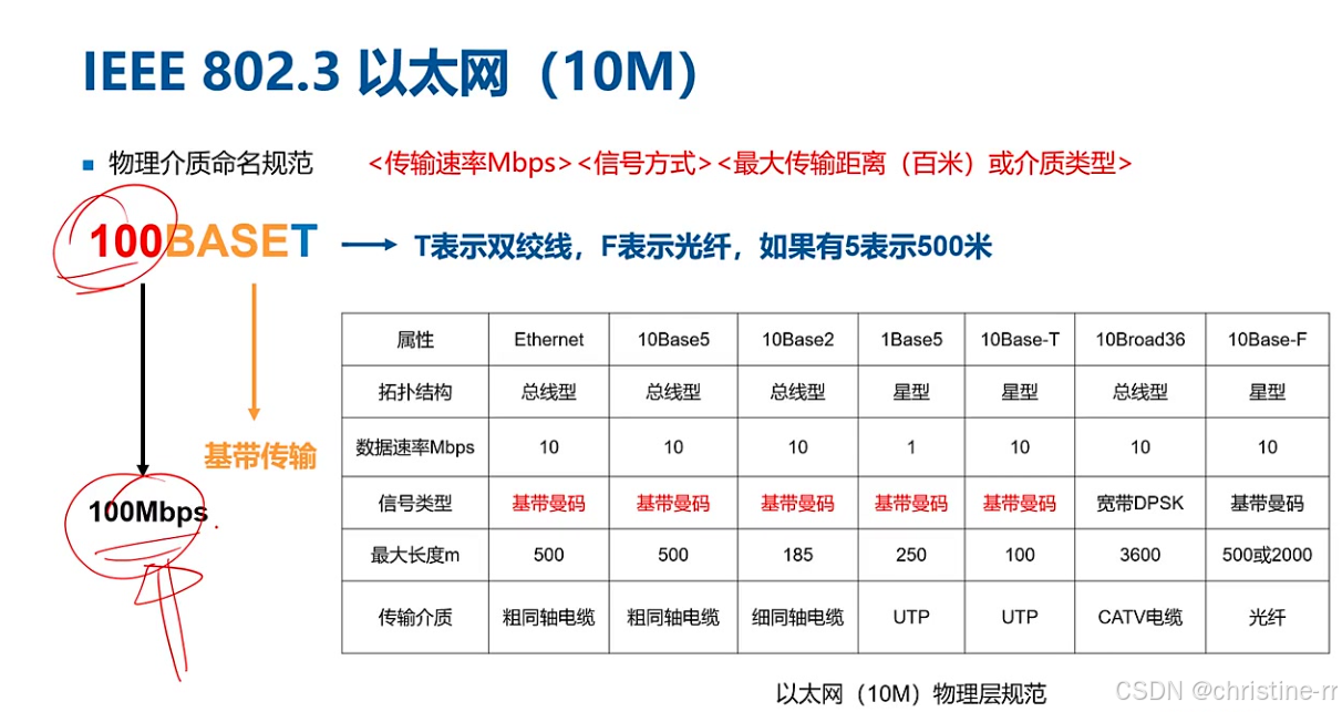 标准代号: IEEE 802.3 命名结构: <传输速率Mbps><信号方式><最大传输距离(百米)或介质类型>