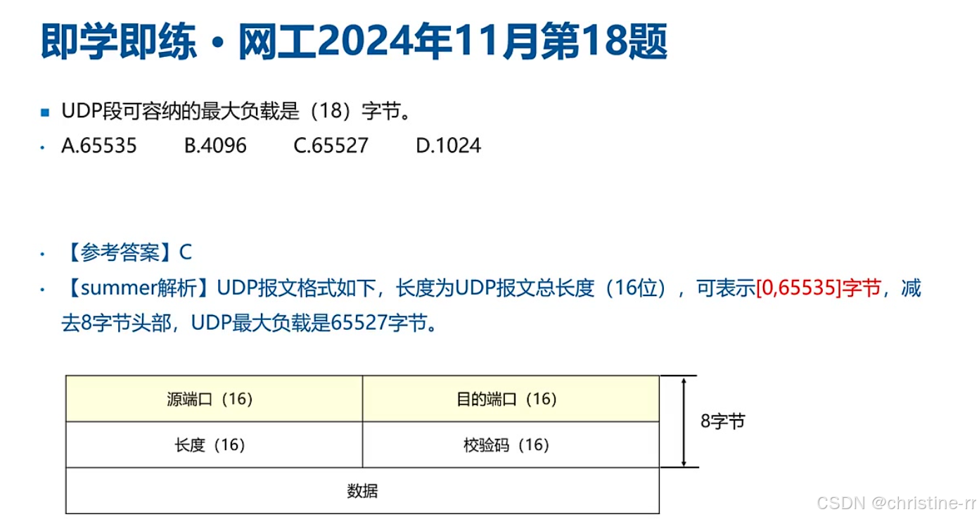 长度字段:UDP总长度16位,最大值21^6−1=655352字节