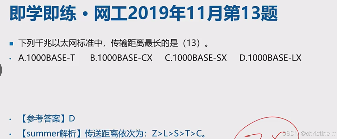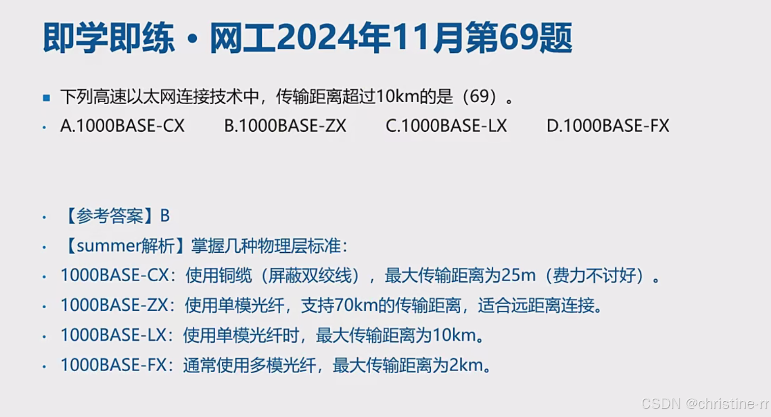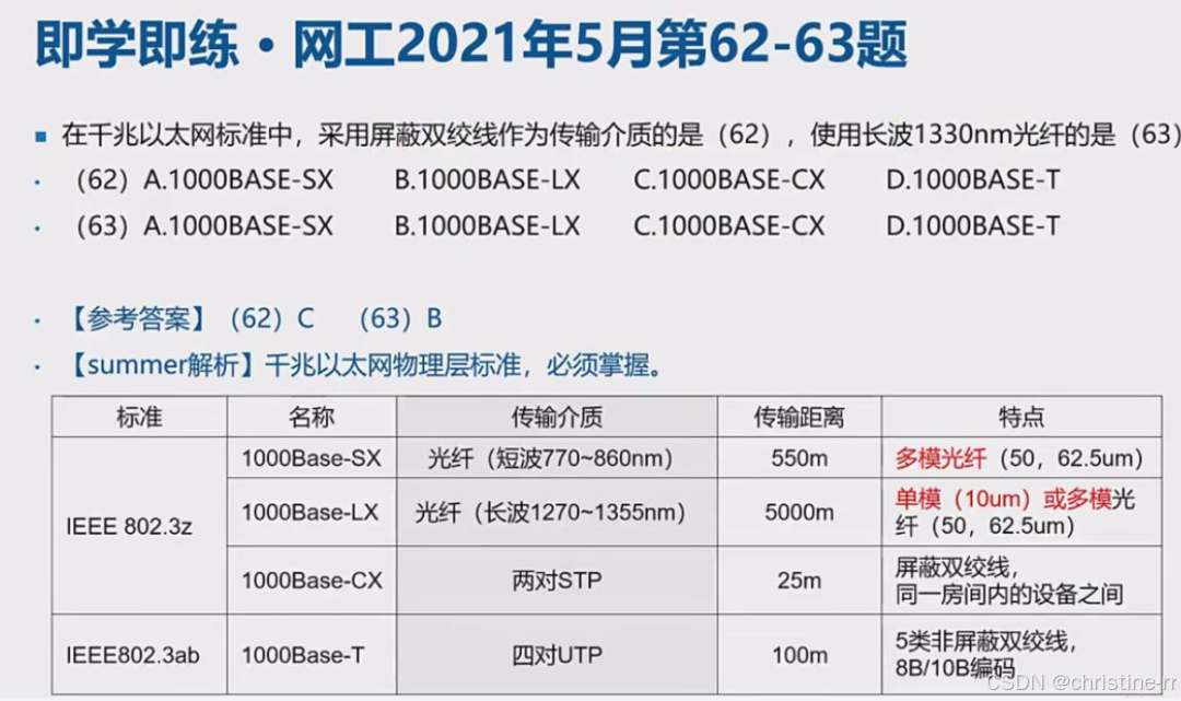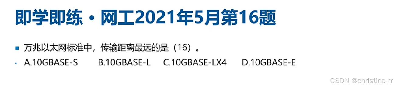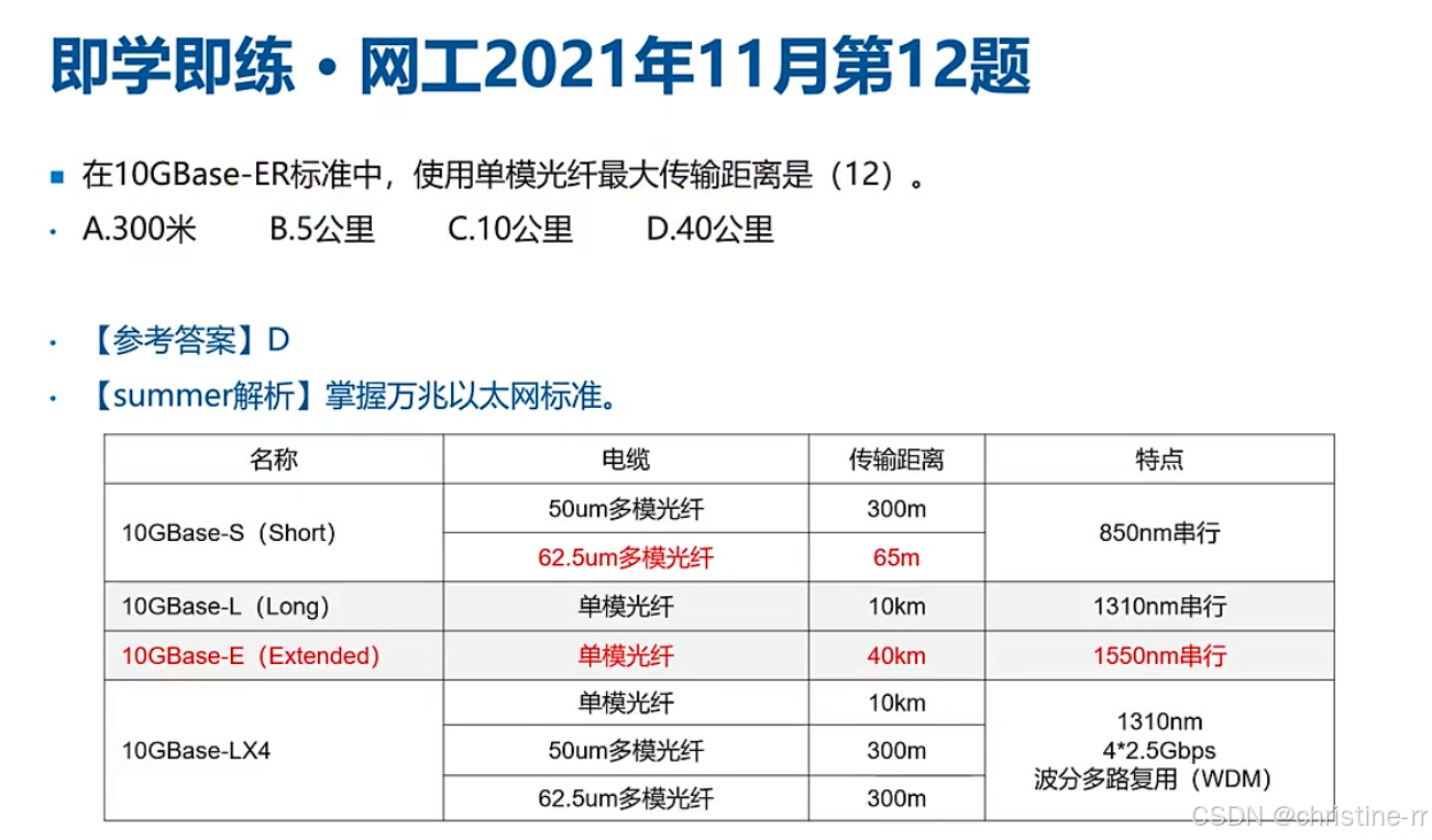 关键记忆: 10GBase-E使用单模光纤,最大传输距离40km