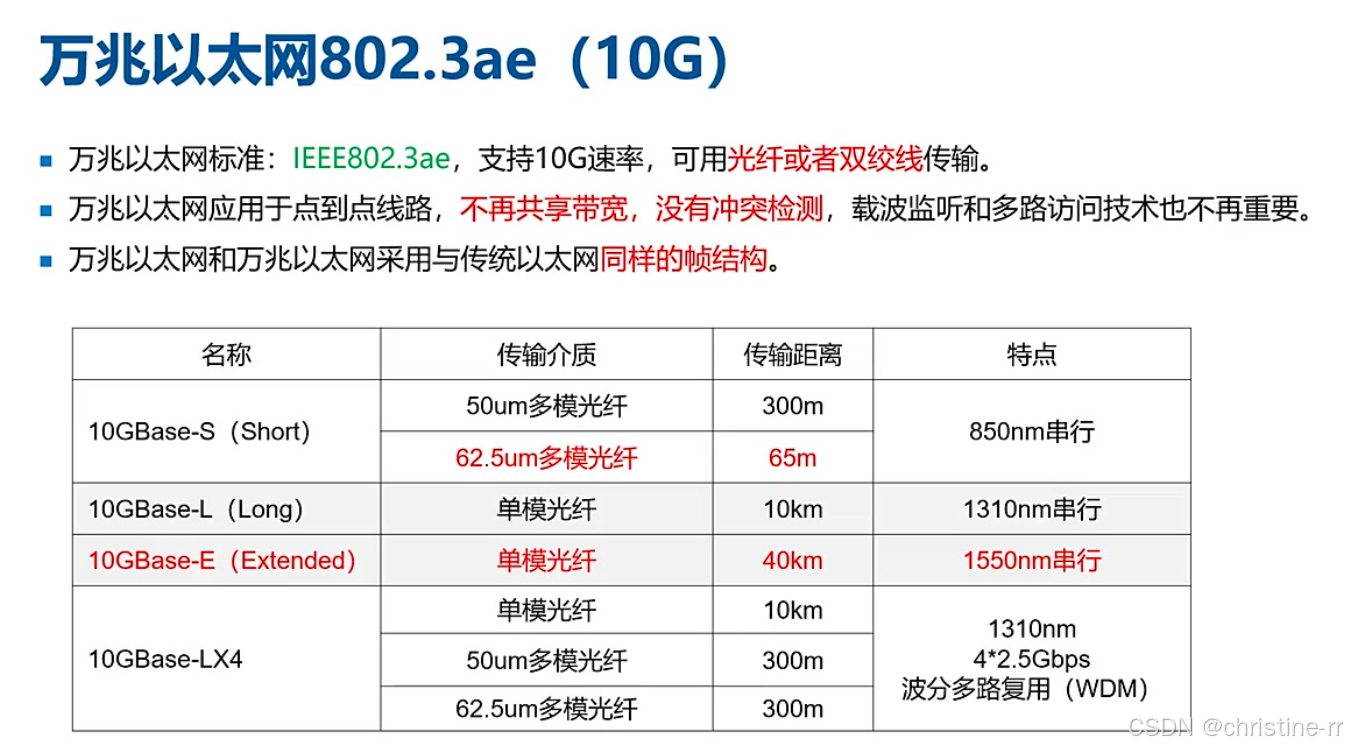 万兆以太网特点 | 点到点线路,全双工,无CSMA/CD协议 | 万兆以太网的特点和协议差异 | 🌟🌟🌟🌟 |