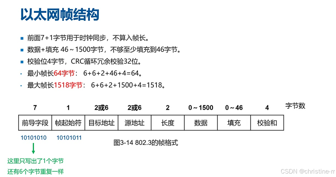 ·同步字段(8字节):前7字节为前导字段(固定模式10101010,其他6个一样),1字节为帧起始符(10101011),用于时钟同步,不计入帧长