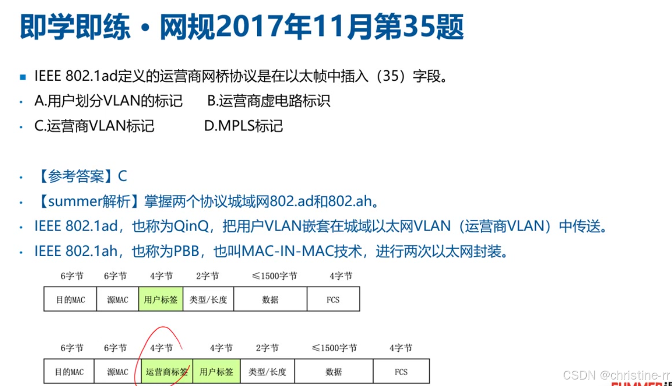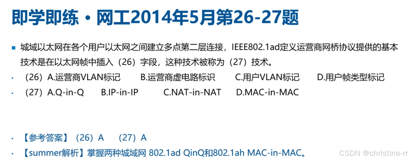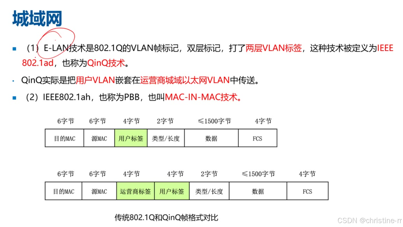 依赖技术 | 基于802.1q VLAN标签实现,两层VLAN标签(QinQ) | QinQ技术实现方式、 标签位置(原MAC地址之后) | 🌟🌟 |