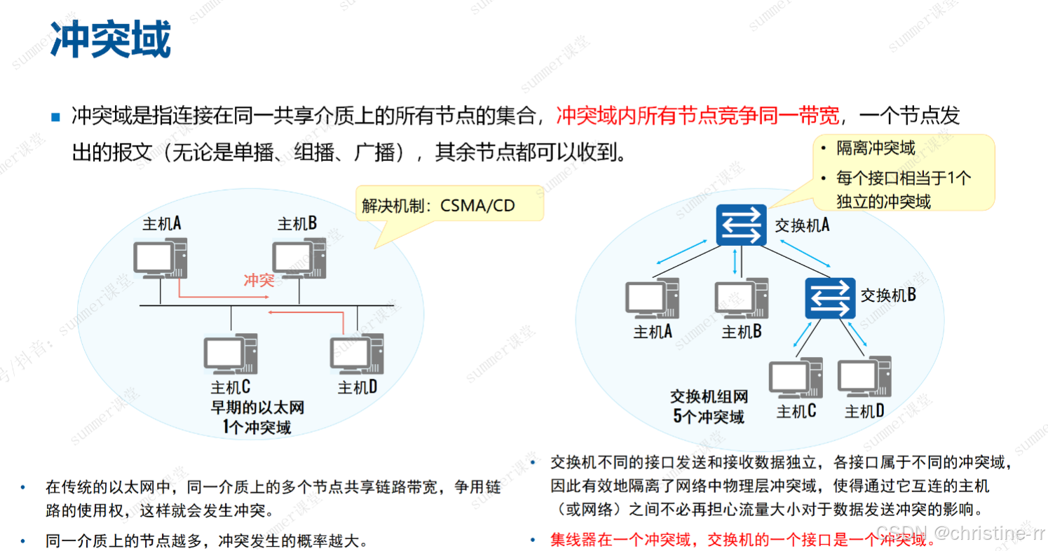 基本概念:连接在同一共享介质上的所有节点集合,节点竞争同一带宽,任一节点发出的报文(单播/组播/广播)均可被其他节点接收。 典型场景: