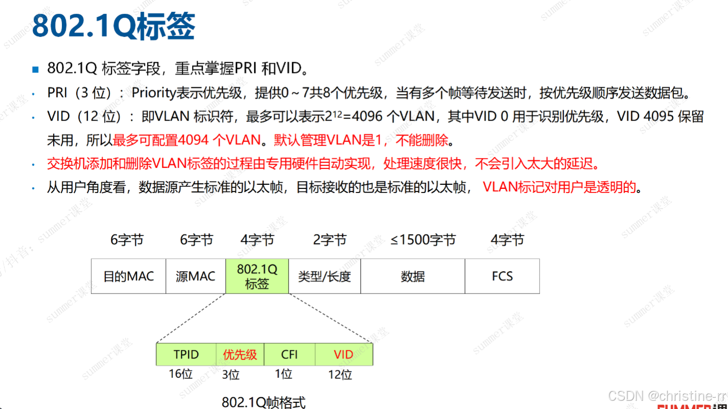 5)802.1Q标签在以太网帧中的位置 具体位置:位于源MAC地址(6字节)之后,类型/长度字段之前 字段组成: