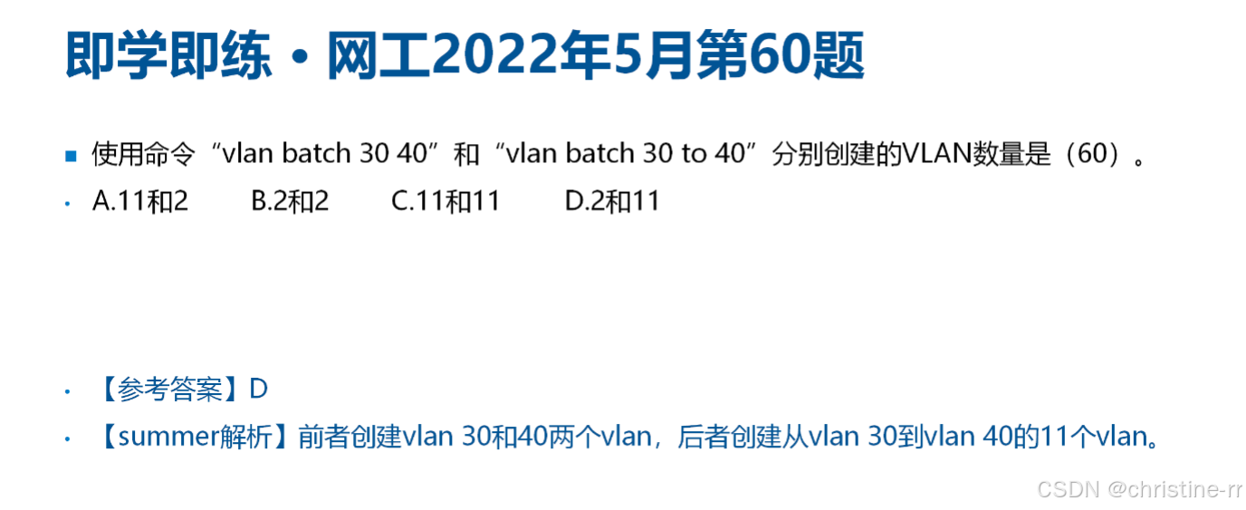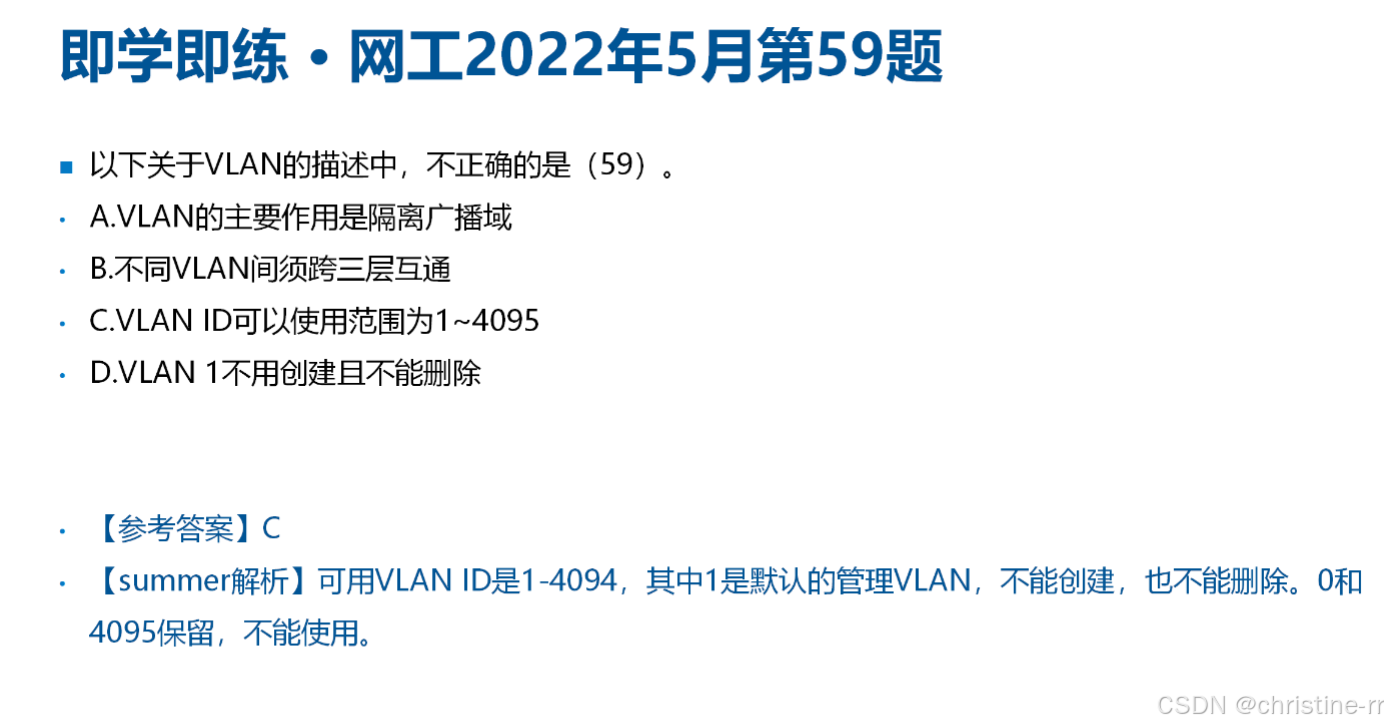 VLAN数量限制 | 标准VLAN:4094个(1-4094) 扩展对比:VXLAN的VNI为24位(约1600万) | 选择题高频:VLAN 0和4095保留 | ⭐⭐ |