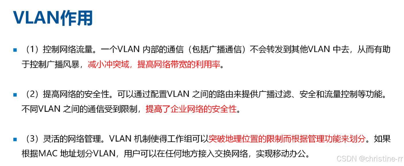 (1)流量控制:限制广播域范围,有效控制广播风暴,减小冲突域,提高带宽利用率 (2)安全增强:通过路由配置实现VLAN间通信过滤,提供流量控制和安全隔离 (3)灵活管理:突破地理限制按功能划分工作组,基于MAC划分时支持移动办公