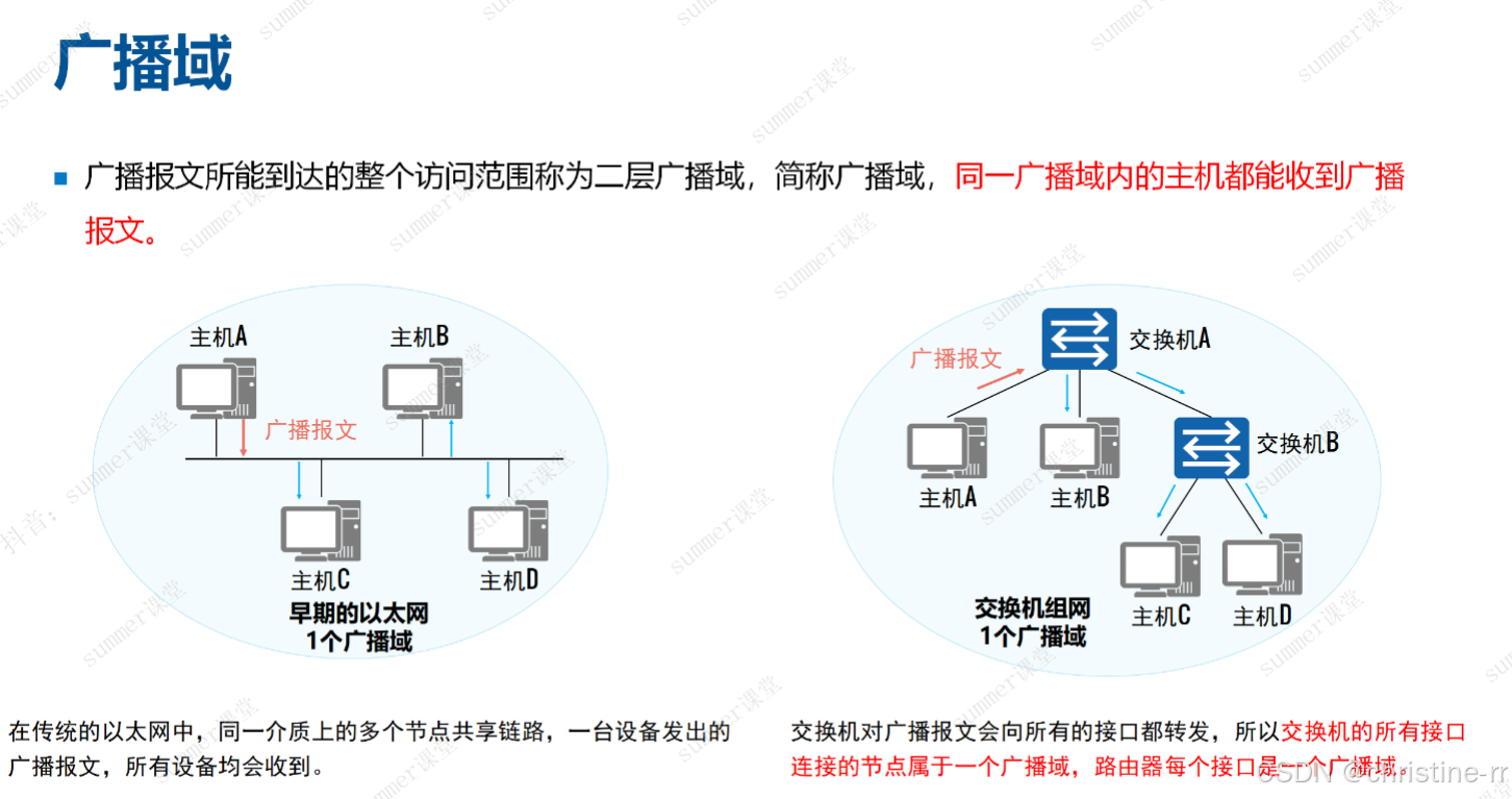定义:广播报文能到达的整个网络范围,同一广播域内主机均可接收广播报文。 设备特性: