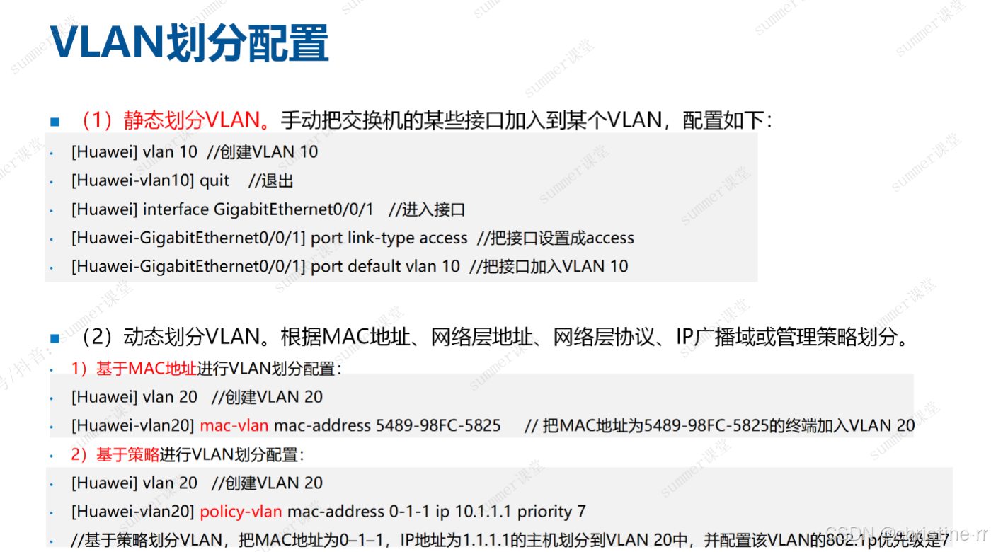 静态划分:基于交换机端口进行划分,将指定接口划入对应VLAN。这是最常用的划分方式。 动态划分:包含四种实现方式: