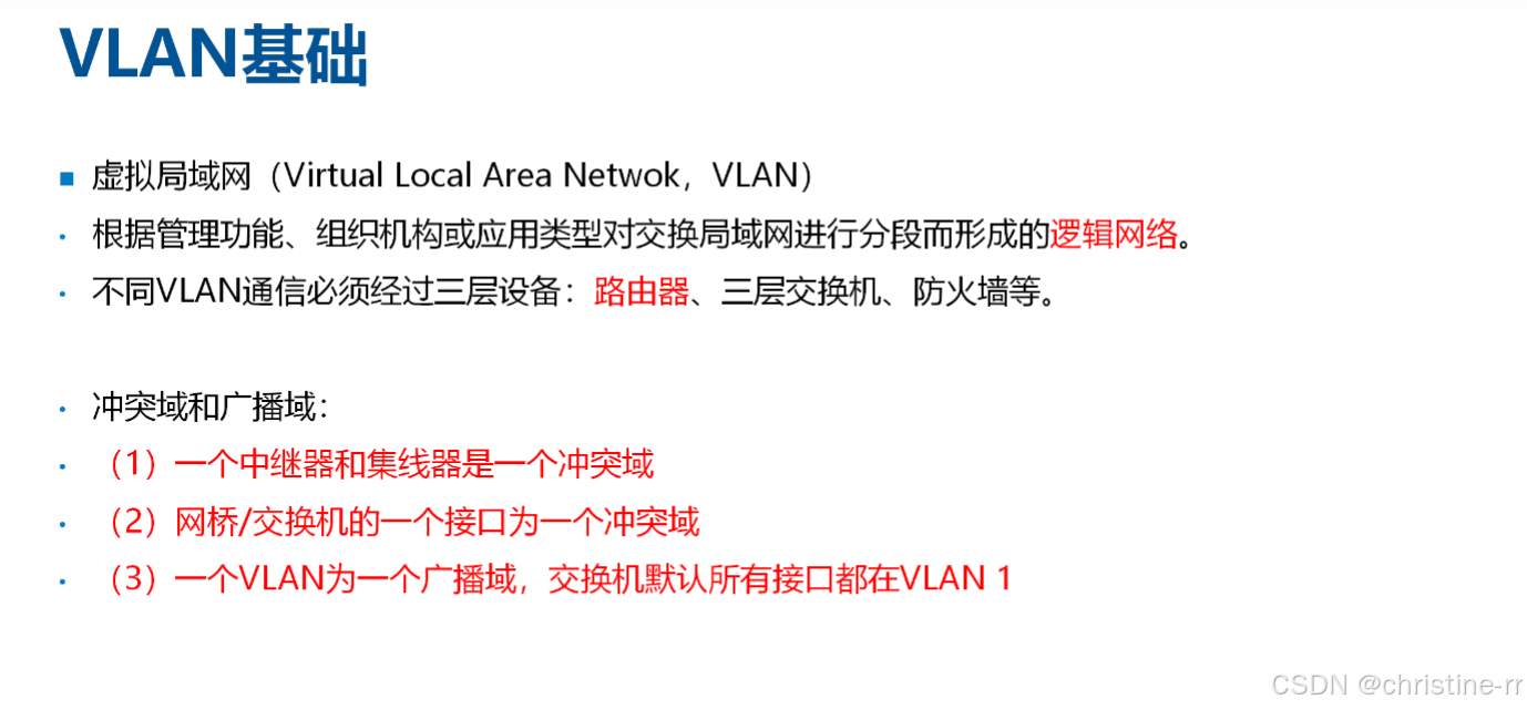 VLAN定义与作用 | 根据管理功能、组织机构或应用类型对交换局域网进行逻辑分段 | VLAN隔离广播域,提升安全性和管理灵活性 | ⭐⭐ |