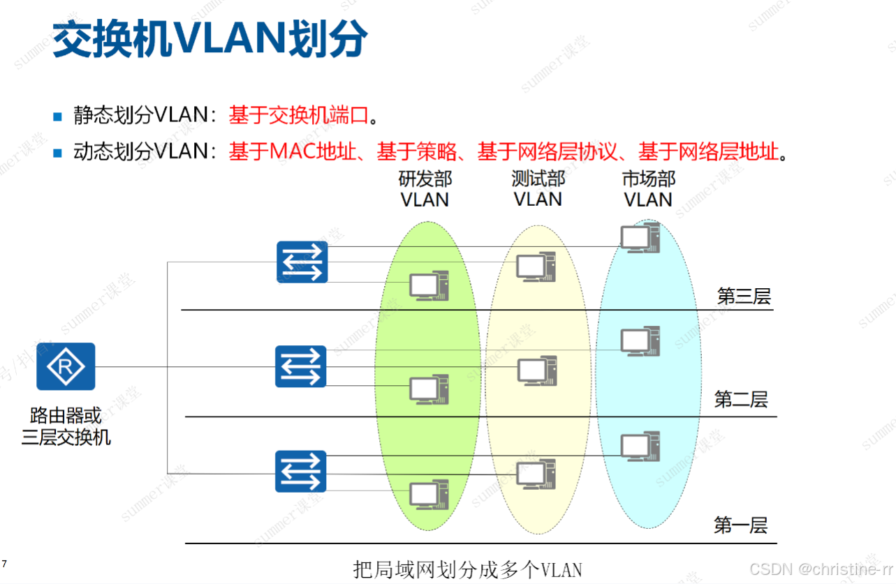 定义:根据管理功能、组织机构或应用类型对交换局域网进行分段而形成的逻辑网络。例如将大型网络划分为多个VLAN(如VLAN1-4)。 优势: