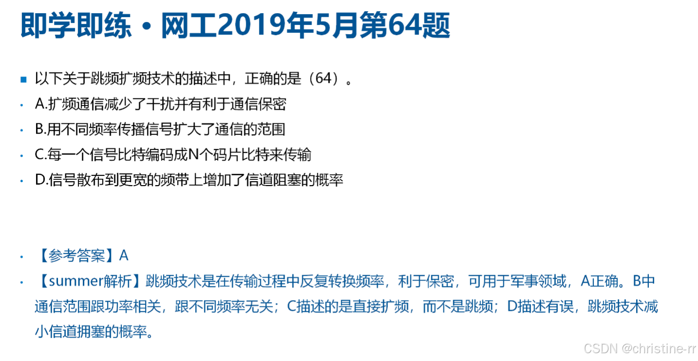 - A正确:跳频减少干扰且利于保密(军事应用)