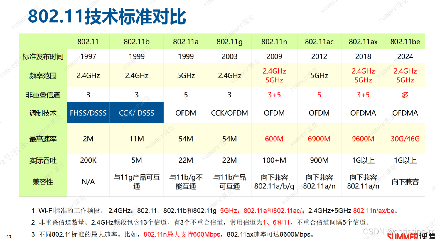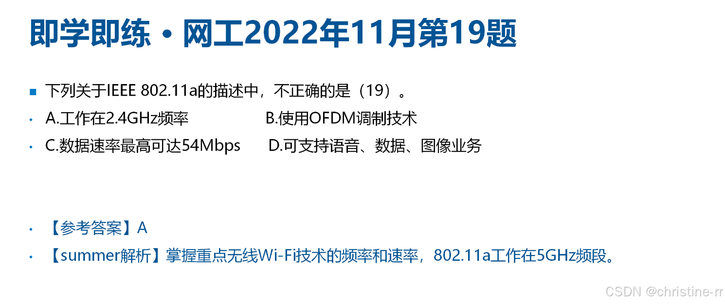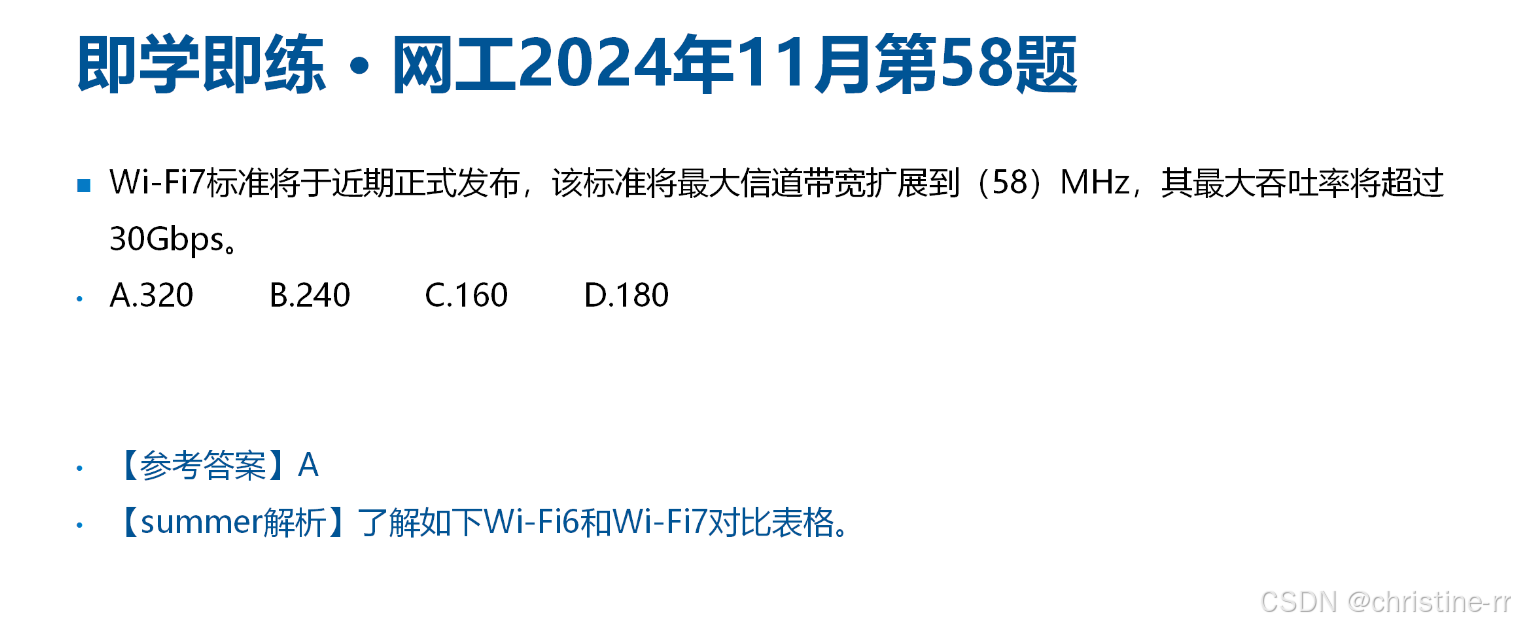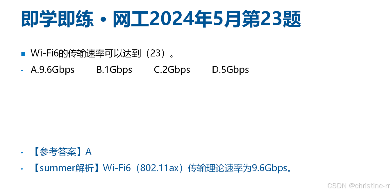- 802.11be速率:教材30Gbps vs 标准46Gbps(考试出现">30G"即正确)