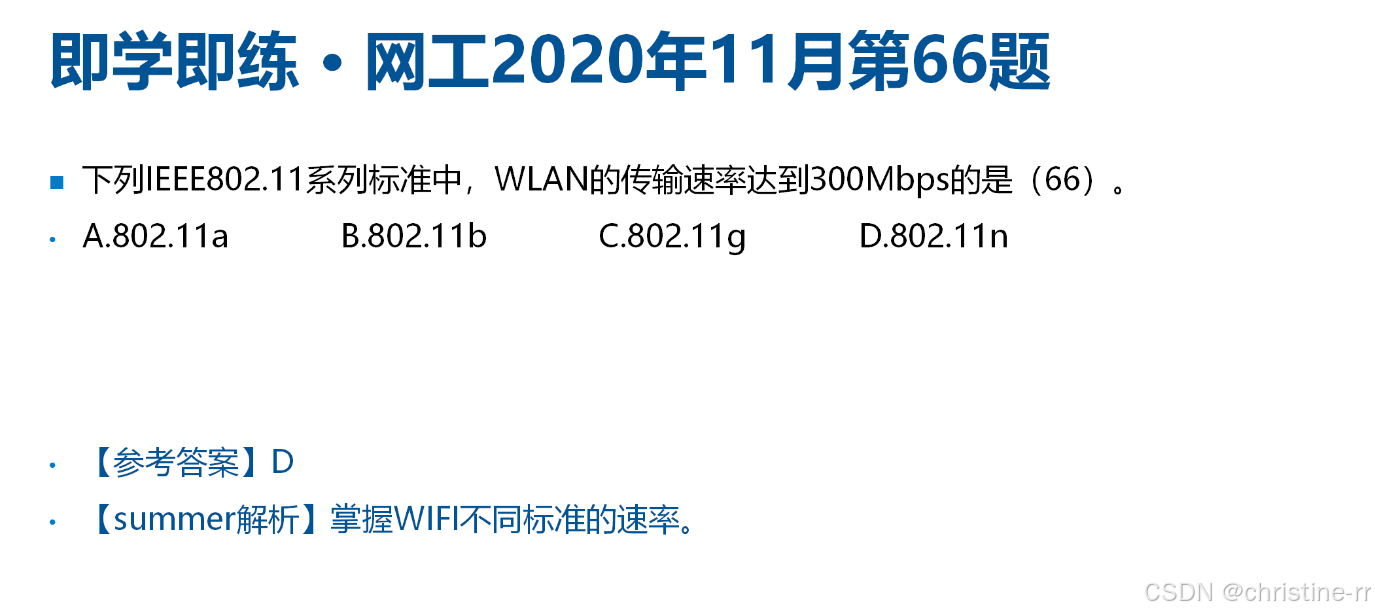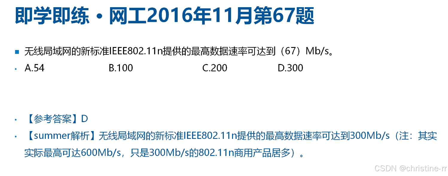 - 802.11n速率:教材600Mbps vs 实际产品300Mbps(考试可能考察)
