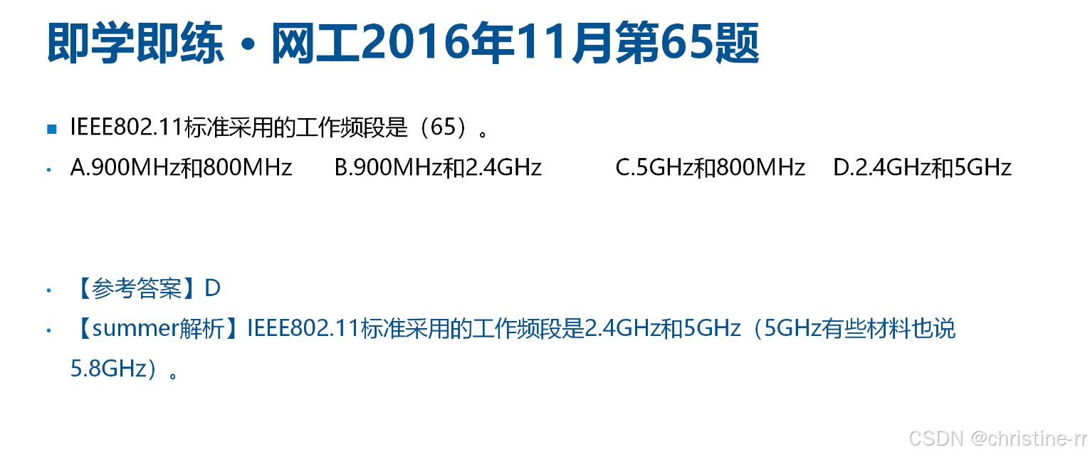 - 关键考点:IEEE 802.11标准的工作频段组合