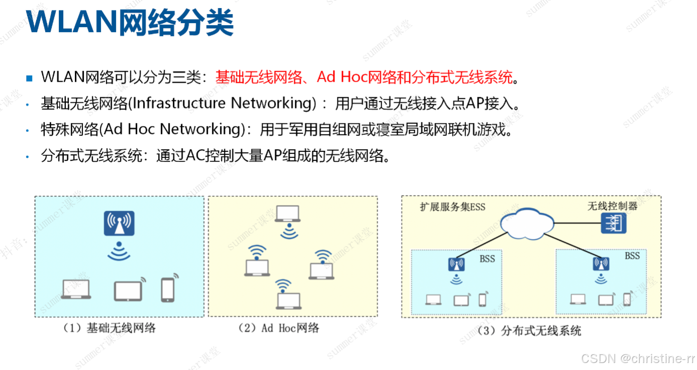 | 基础无线网络(中心节点)、AD Hoc网络(自组织)、分布式无线系统(多AP组网) | | |