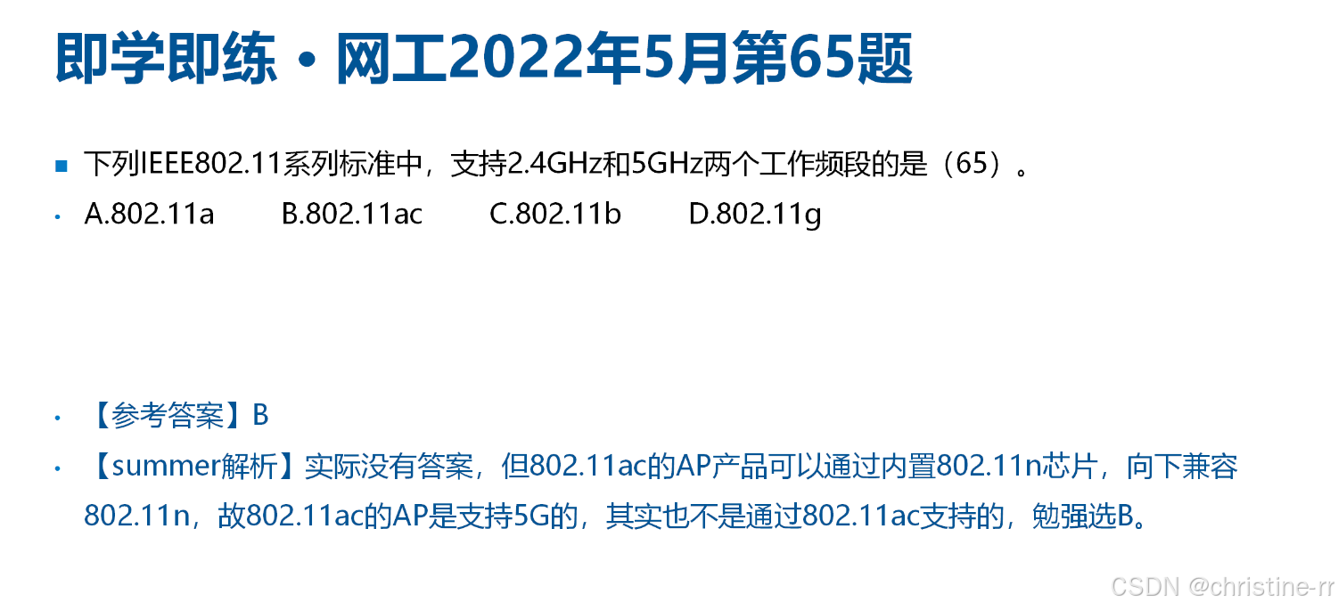 - 解析:标准规定802.11同时支持2.4GHz和5GHz双频段