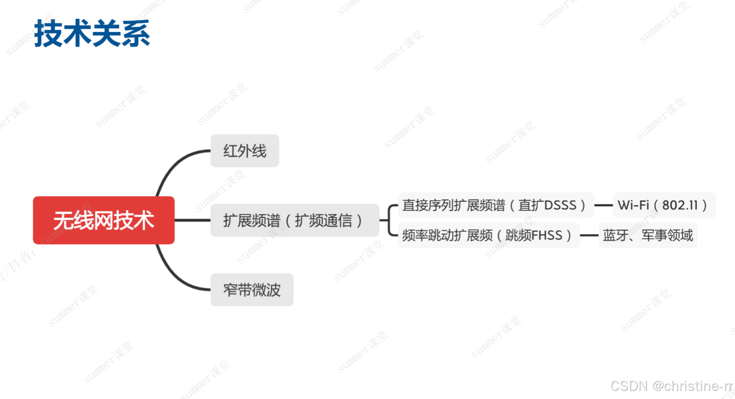 - 无线网技术分为红外线、扩频通信和窄带微波三大类