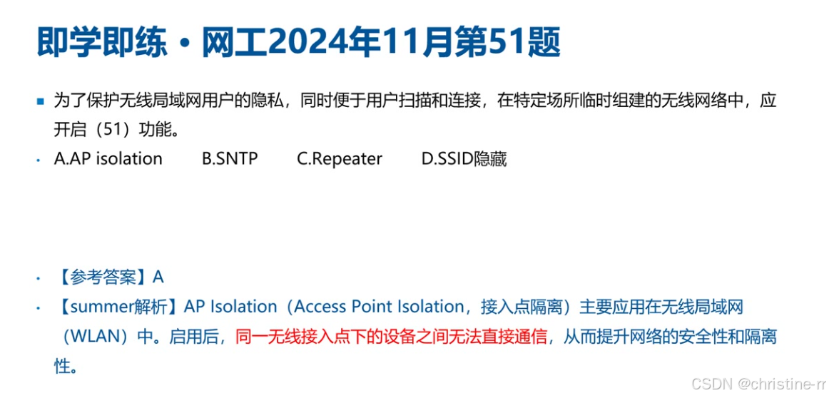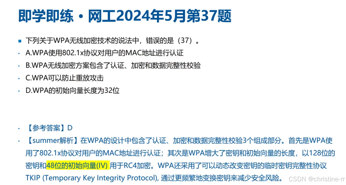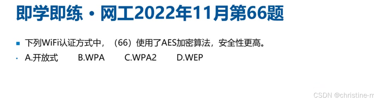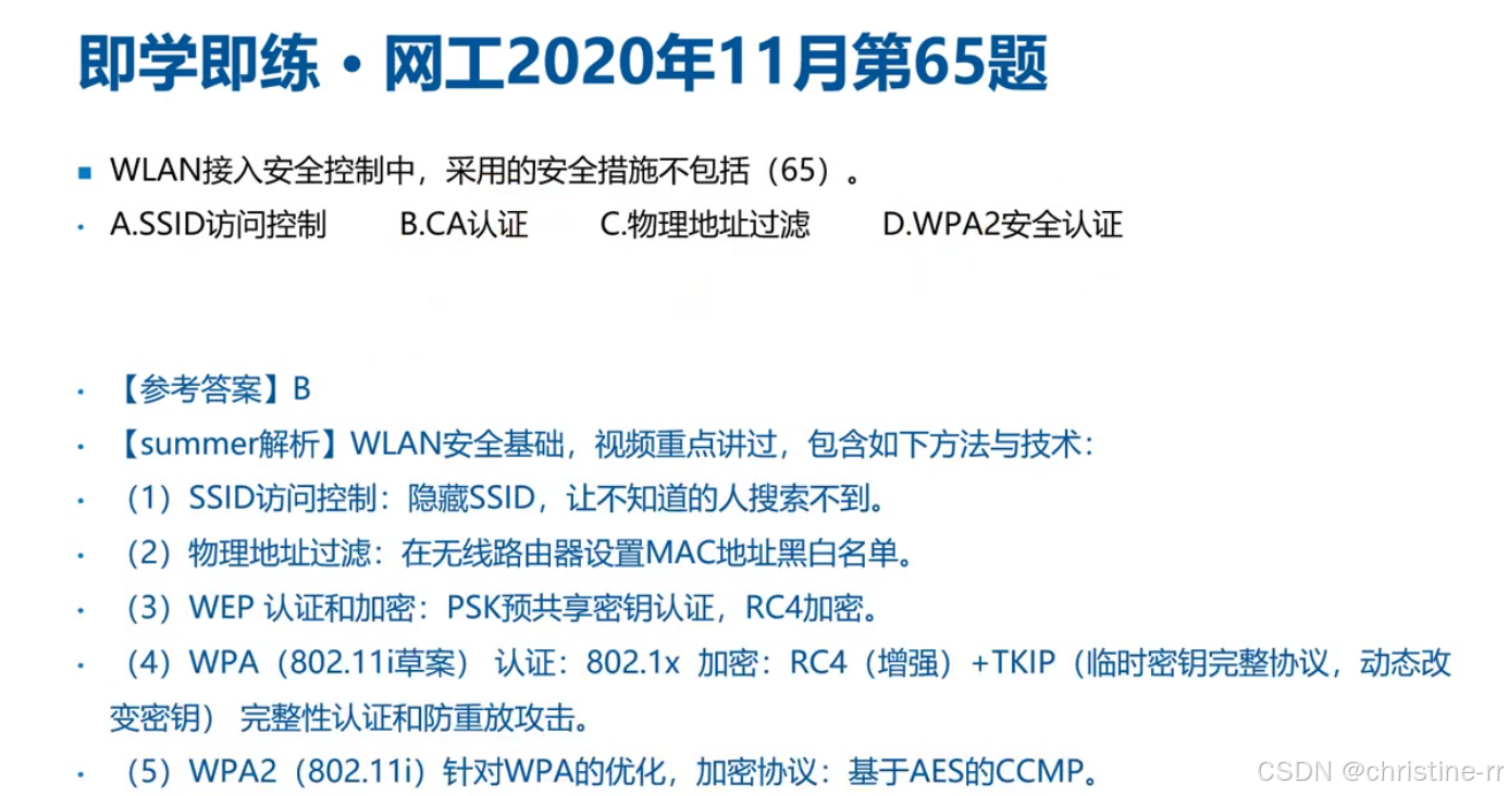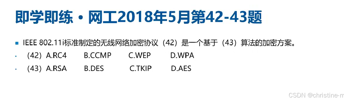 真题高频考点 | - WPA2加密算法=AES-CCMP; - 802.11i对应WPA2; - WEP的IV重复风险 | 混淆点:TKIP在WPA/WPA2中的角色 | ⭐⭐⭐⭐ |