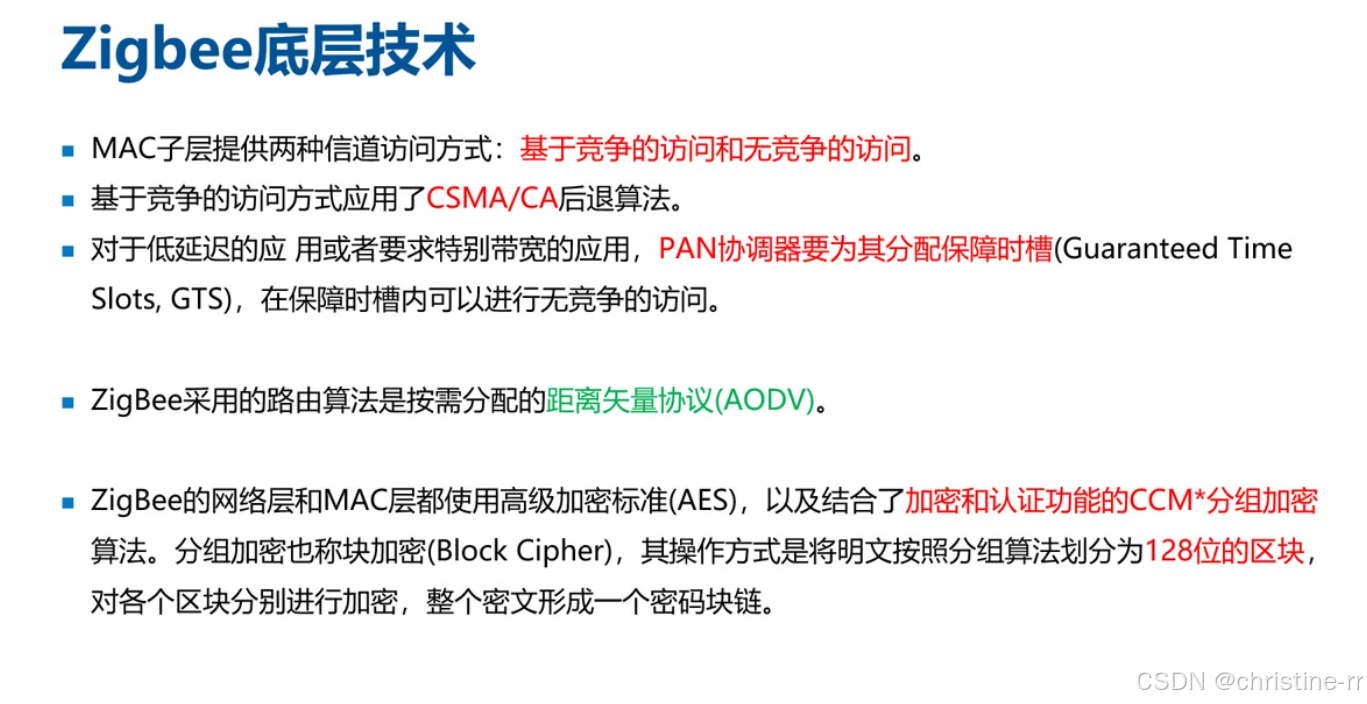 ZigBee底层技术 | - 信道访问:竞争(CSMA-CA)与非竞争(时槽分配) - 路由算法:AODV(距离矢量) - 加密:128位分组加密 | 对比WIFI的CSMA-CA机制,强调安全性差异 | ⭐⭐⭐⭐ |