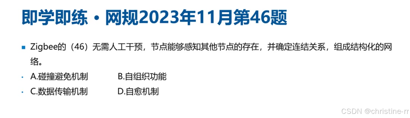 自组织功能(ZigBee) | 节点自动组网,无需人工干预 | 常考选择题(如形成结构化网络的关键功能) | ⭐⭐ |
