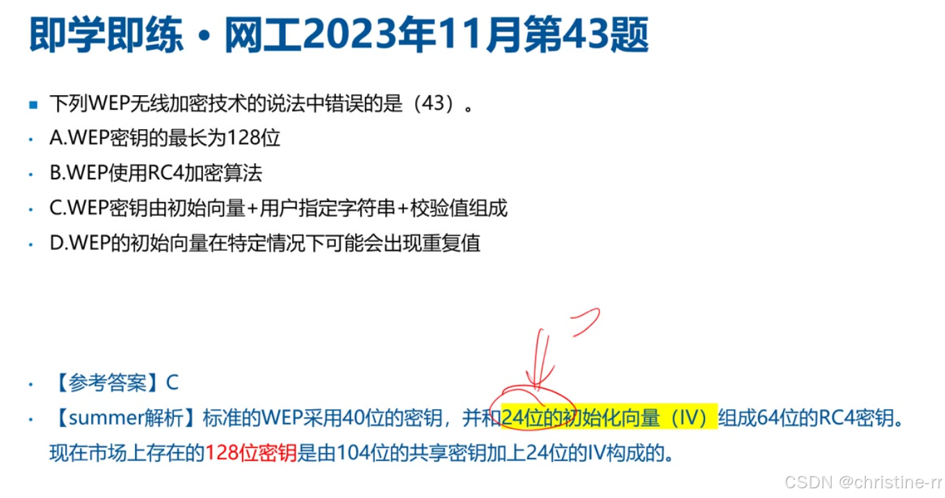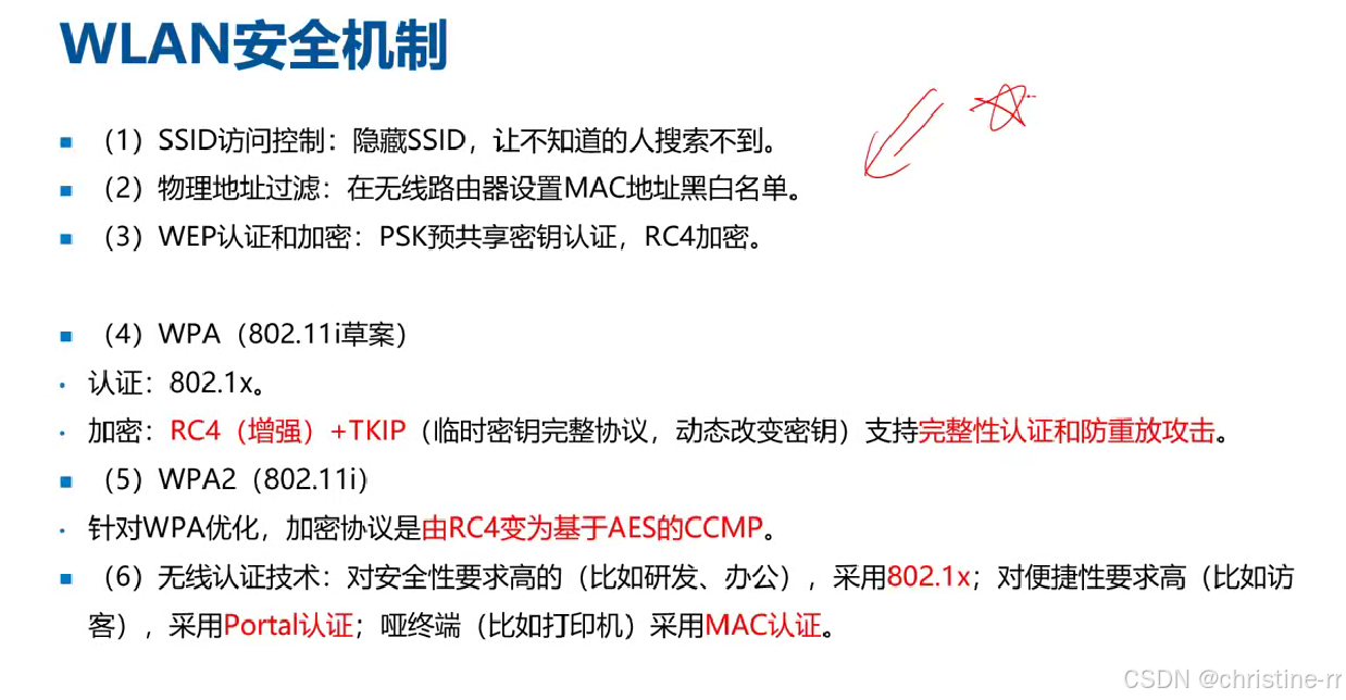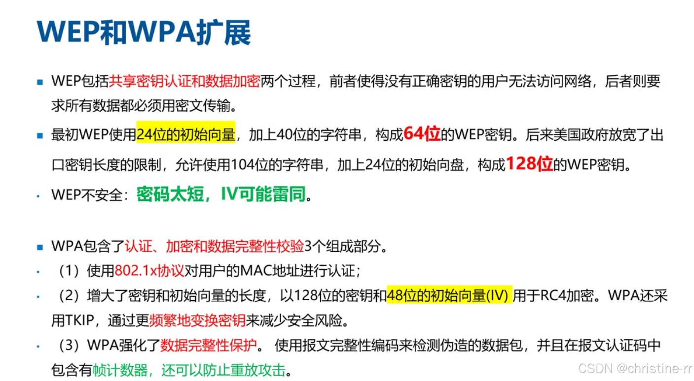 WEP安全机制 | - 认证:预共享密钥(如WIFI密码); - 加密:RC4算法; - 密钥长度:64位(24位IV+40位字符串)或128位(24位IV+104位字符串) | IV(初始化向量)仅24位导致安全隐患; RC4加密的淘汰原因 | ⭐⭐⭐ |