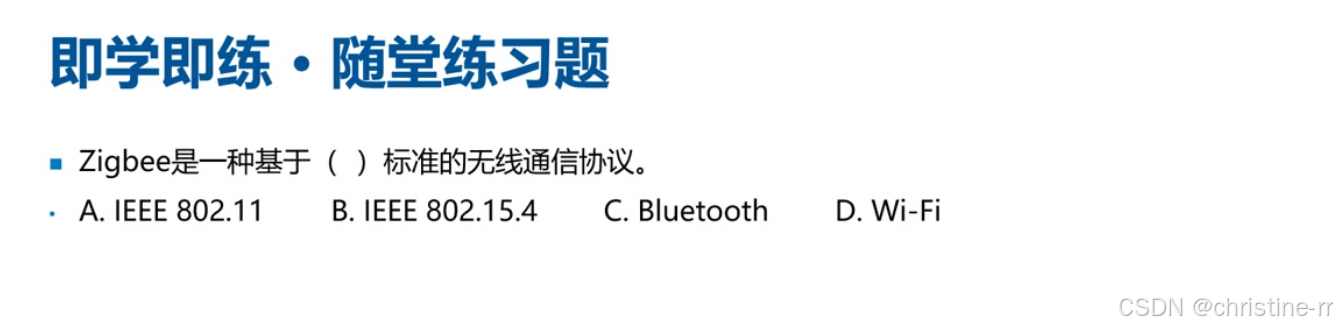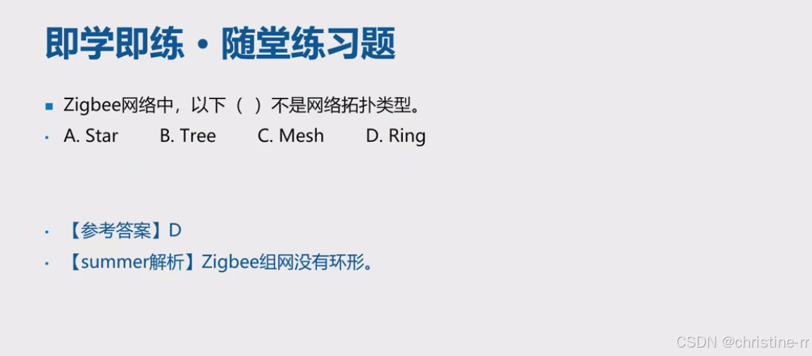 ZigBee组网结构 | 支持星型和点对点拓扑,无环形结构 | 考试可能排除非标准拓扑(如环形) | ⭐⭐ |