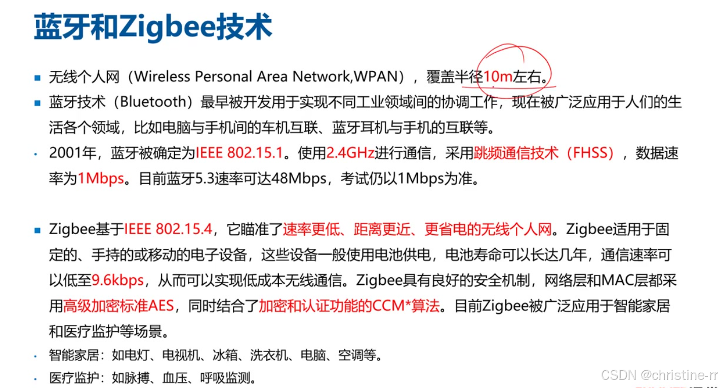 蓝牙技术 | 用途:蓝牙鼠标/耳机/音响、车机互联; 频段:2.4GHz; 速率:1Mbps(考试默认低速) | 考试可能考蓝牙标准编号(802.15.1)及低速传输特性 | ⭐⭐ |
