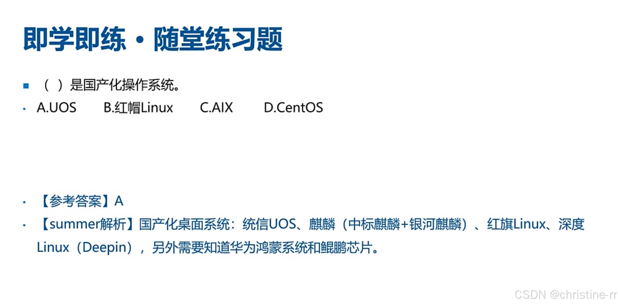 国产操作系统清单 | 麒麟(支持多国产CPU)、统信UOS(家庭/专业/服务器版)、红旗Linux、华为鸿蒙(终端)、华为欧拉(服务器) | 必考选择题: 区分国产与非国产系统(如Ubuntu、Red Hat为国外) | ⭐⭐⭐⭐ |