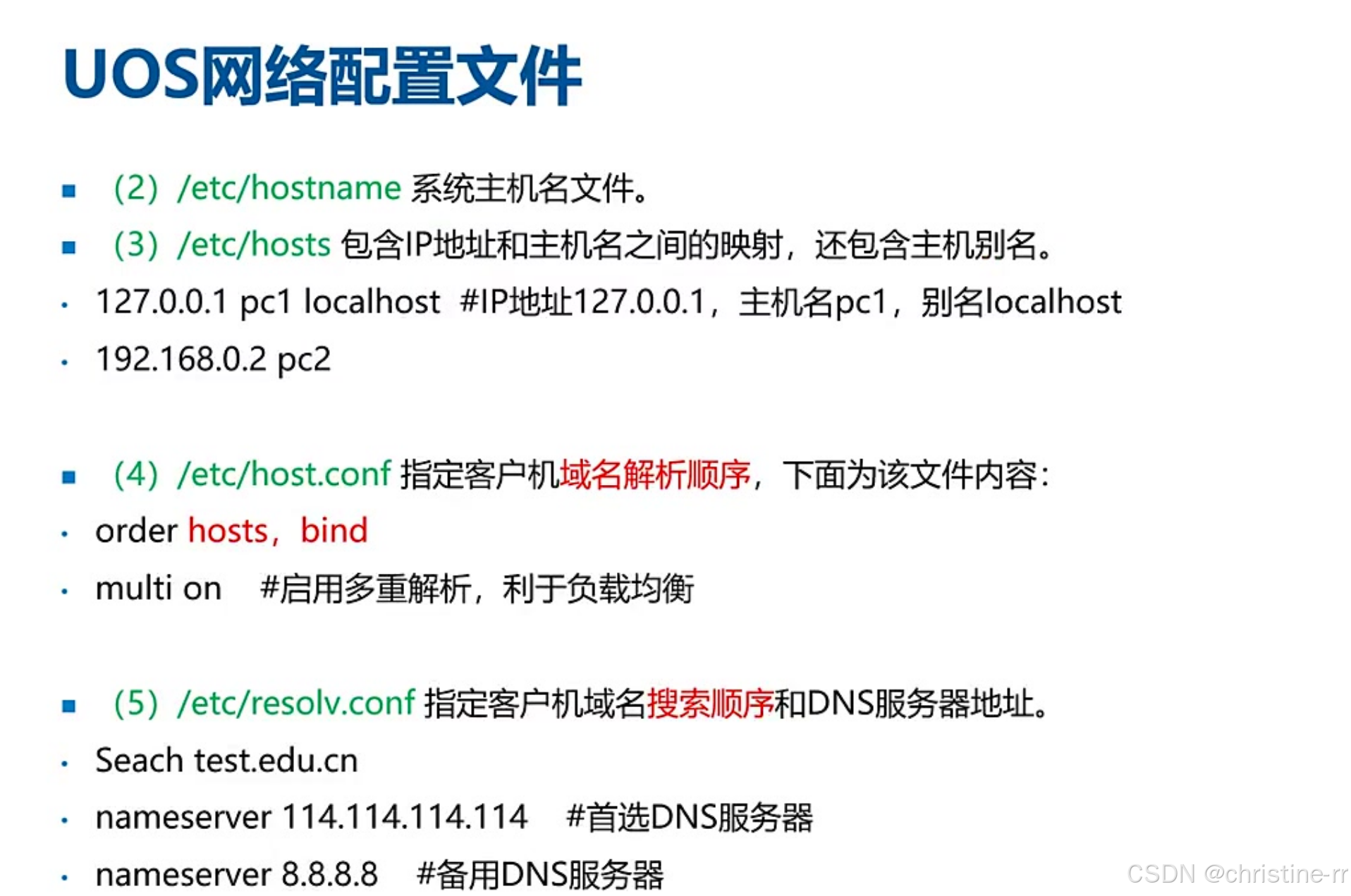 DNS解析顺序配置 | /etc/host.conf定义解析顺序(order hosts,bind),/etc/resolv.conf配置DNS服务器 | 典型配置:nameserver 114.114.114.114(电信DNS) | ★★★☆☆ |