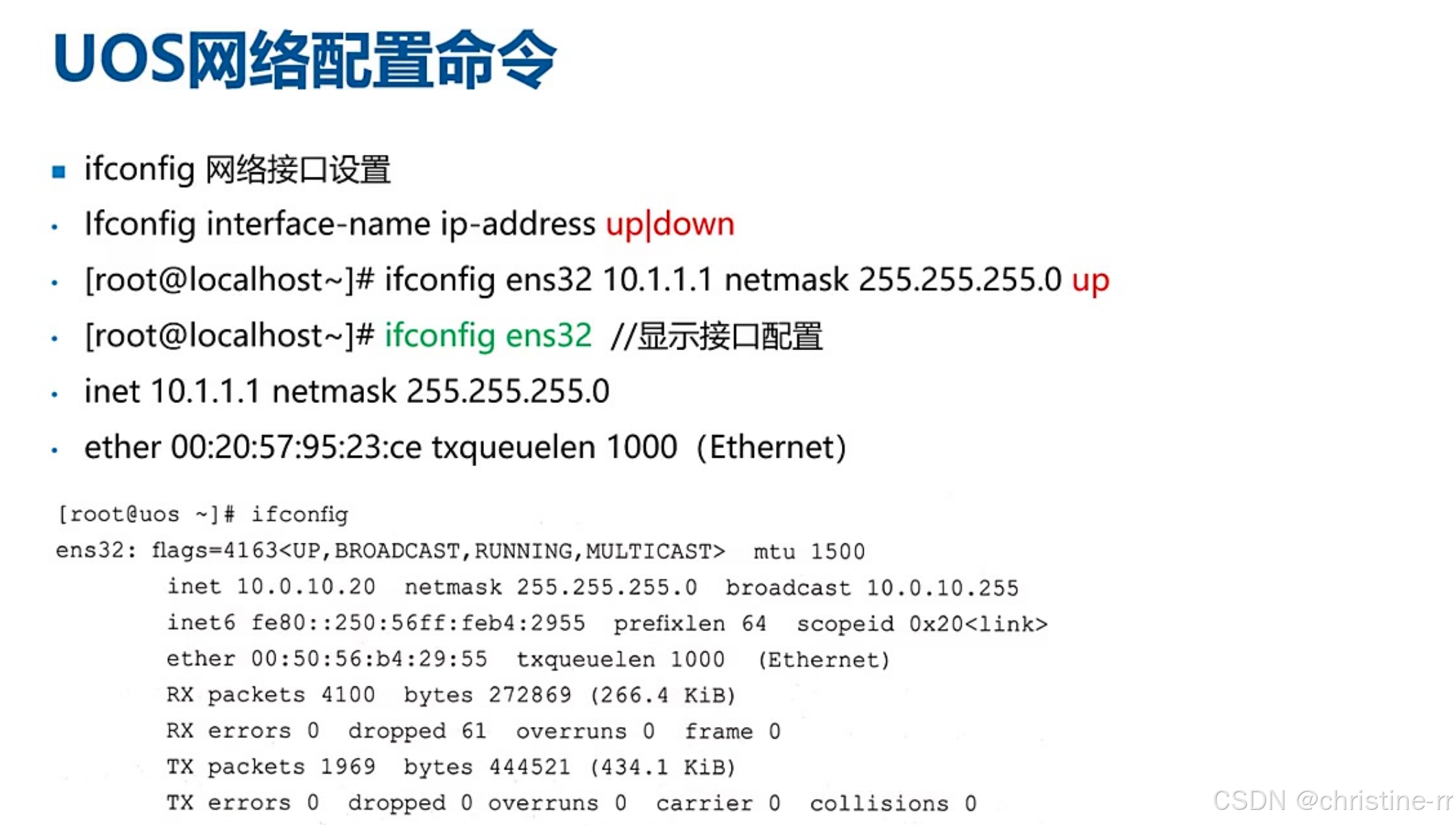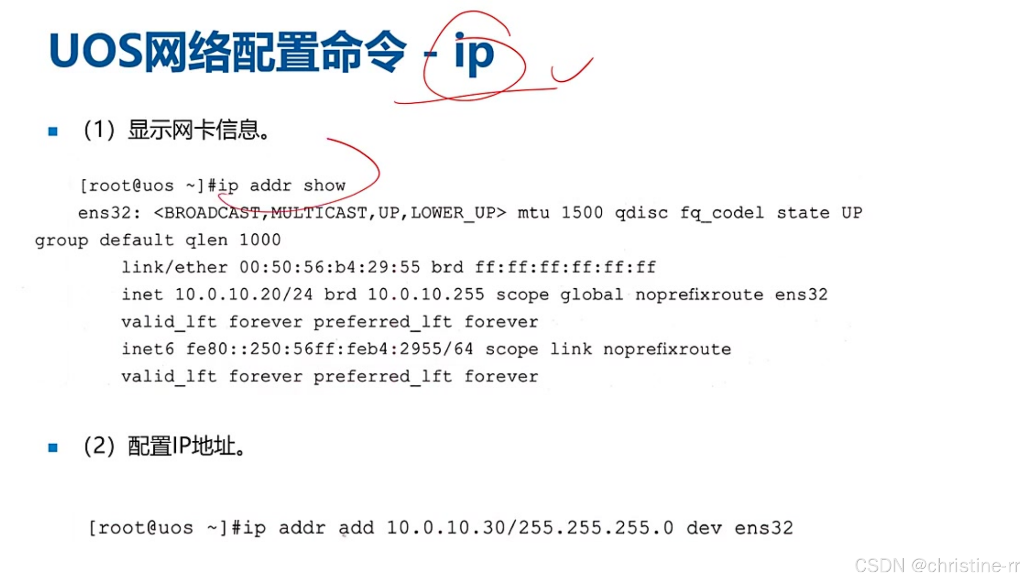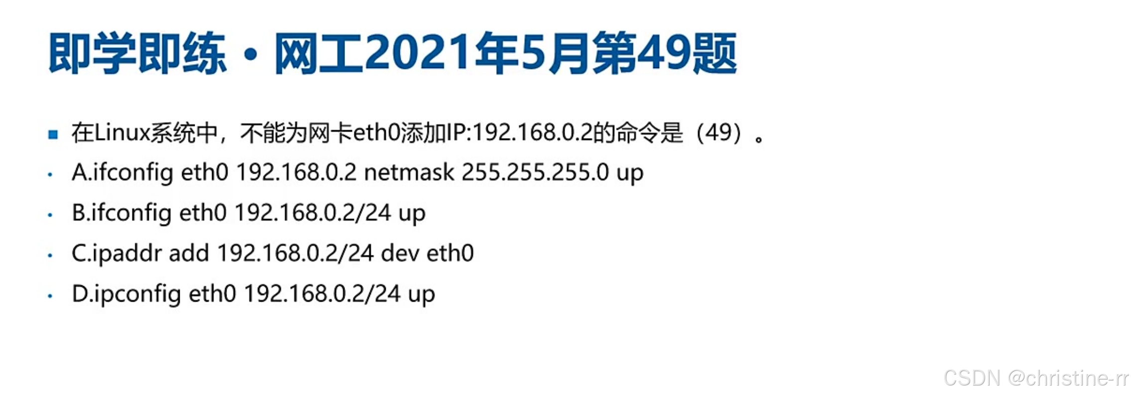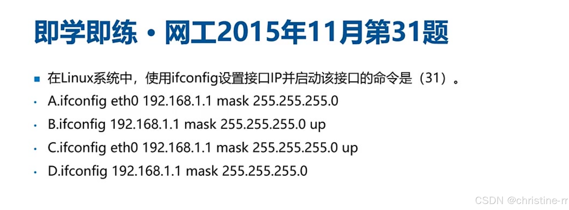 网络接口配置命令 | ifconfig <接口> <IP> netmask <掩码> up 或 ip addr add <IP>/<掩码位数> dev <接口> | 版本差异:ifconfig(传统) vs ip(新版) | ★★★★☆ |