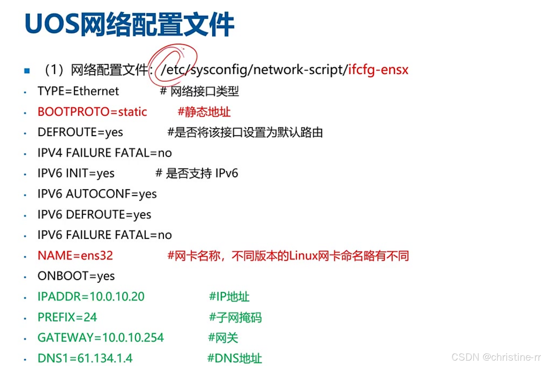 网卡配置文件 | 位于/etc目录下,命名规则为ifcfg-<接口名>(如ifcfg-ens32),包含IP地址、子网掩码、网关等参数 | 命名差异:不同Linux版本接口名不同(UOS/ethX/enoX) | ★★☆☆☆ |