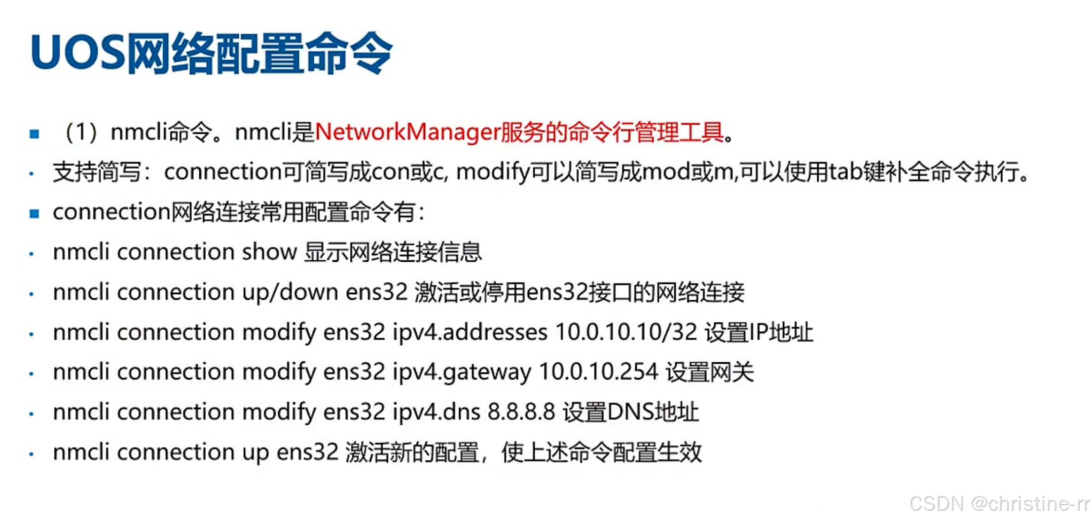 网络服务重启命令 | nmcli c reload(NetworkManager命令行)或systemctl restart network | 命令缩写:nm=network manager, cli=command line interface | ★★★☆☆ |