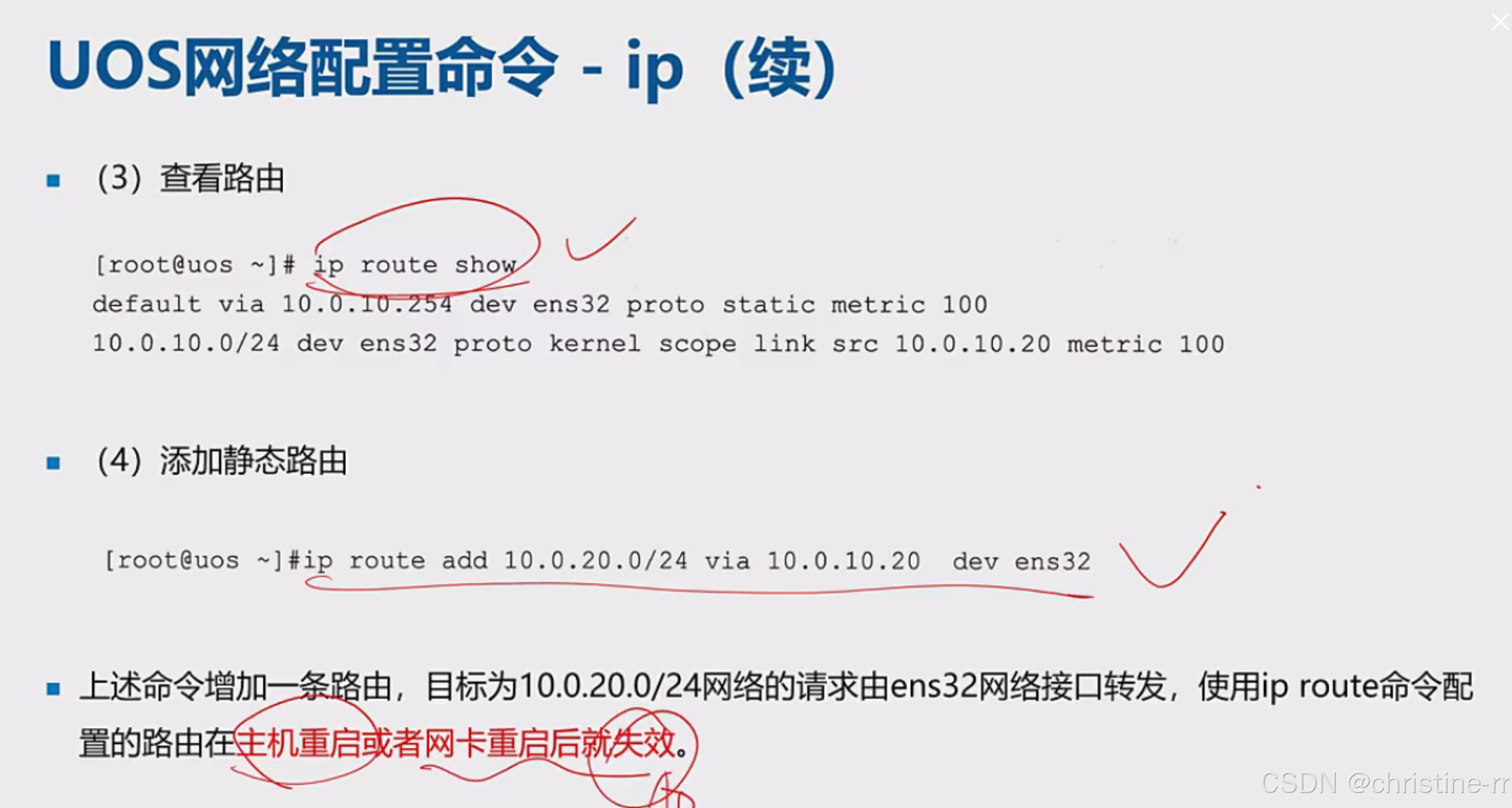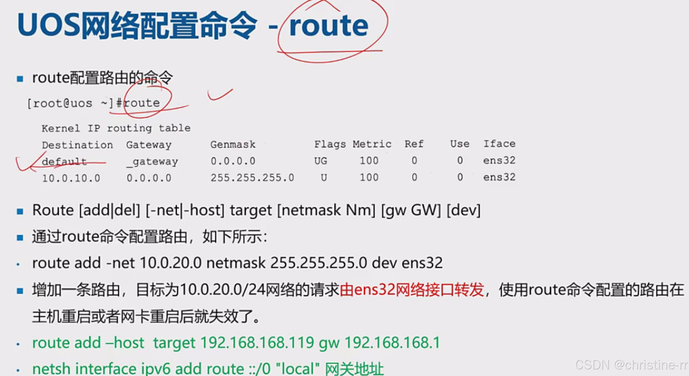 路由管理命令 | route查看路由表,ip route add添加路由(如ip route add 192.168.1.0/24 dev ens32) | 临时性:命令配置重启失效,需写入配置文件 | ★★★★☆ |