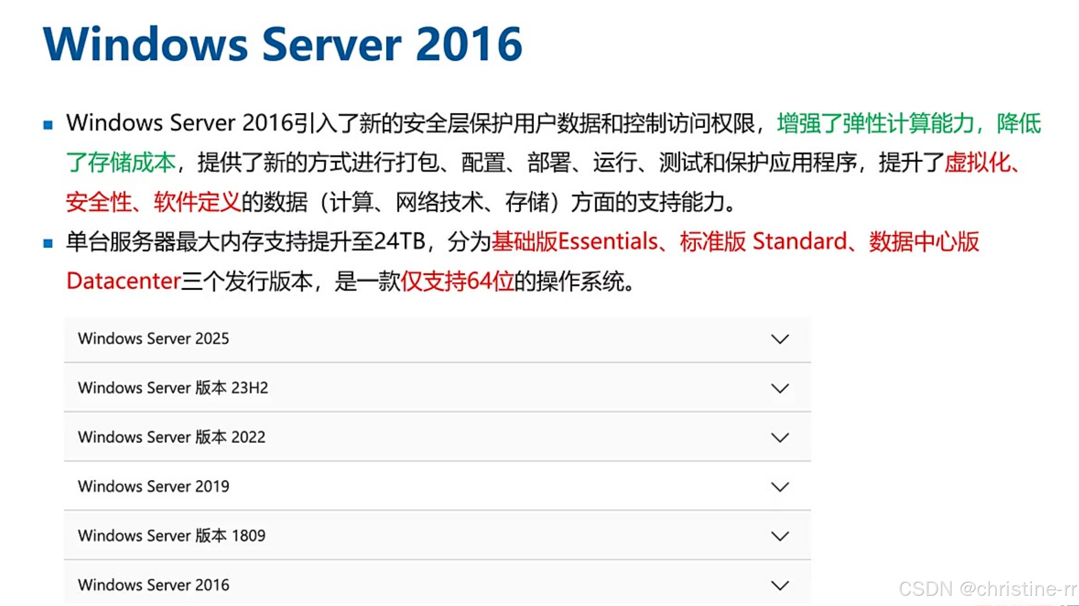 版本特点:分为基础版(Essentials)、标准版(Standard)、数据中心版(Datacenter)三个发行版本,仅支持64位操作系统,2^64,相比32位系统仅支持4GB内存(2^32字节)
