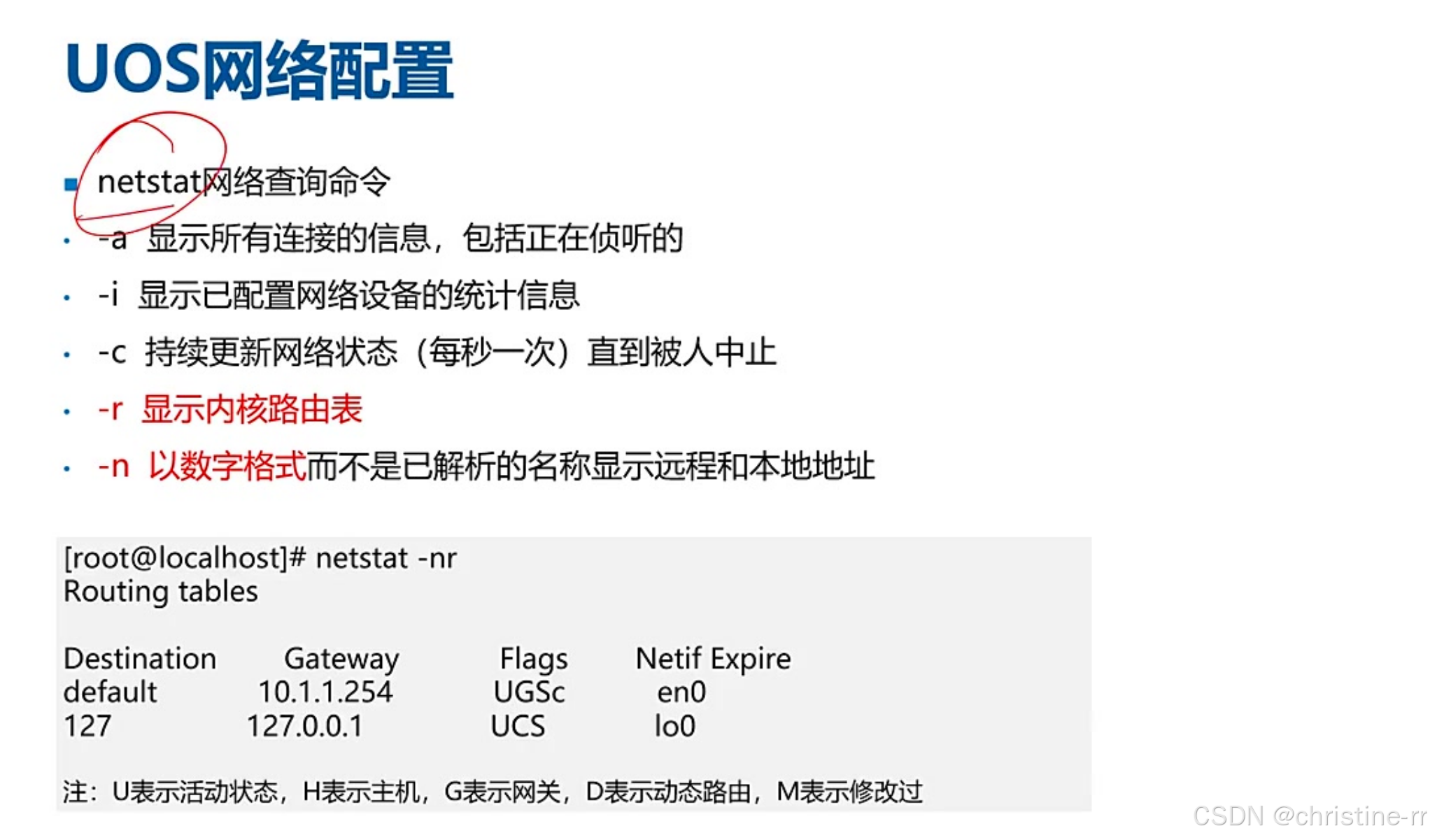 网络状态查询 | netstat -nr(数字形式显示路由表), -a显示所有连接,-i显示接口信息 | 重点参数: -n禁用域名解析, -r显示路由表 | ★★★☆☆ |