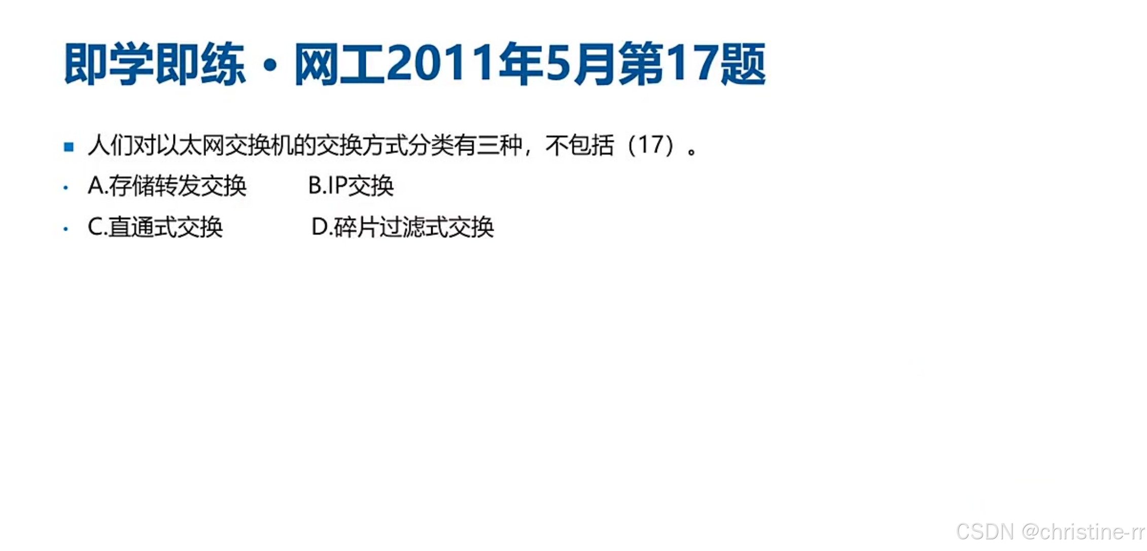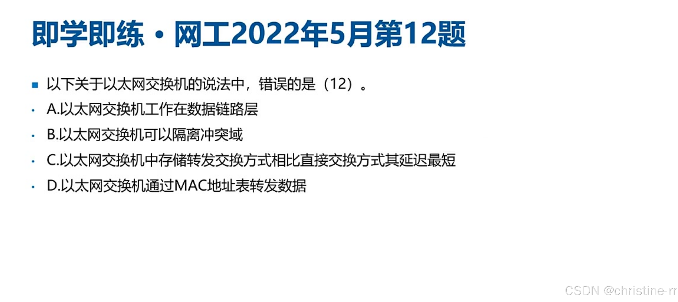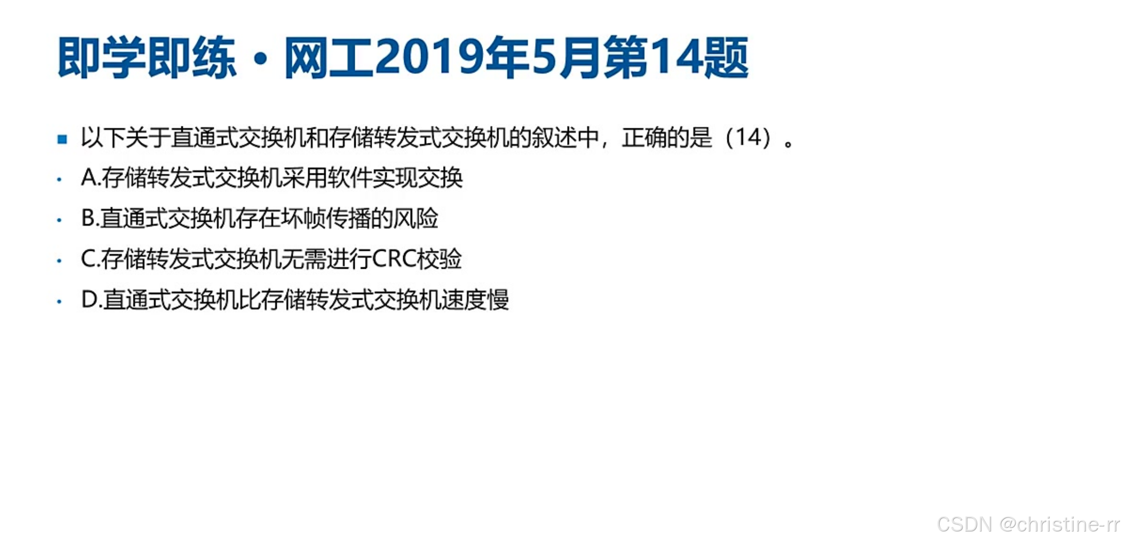 存储转发式交换 | 接收完整数据帧,进行验证和碎片过滤后转发 | 优缺点(差错校验、非对称交换、延迟大) | 中 |