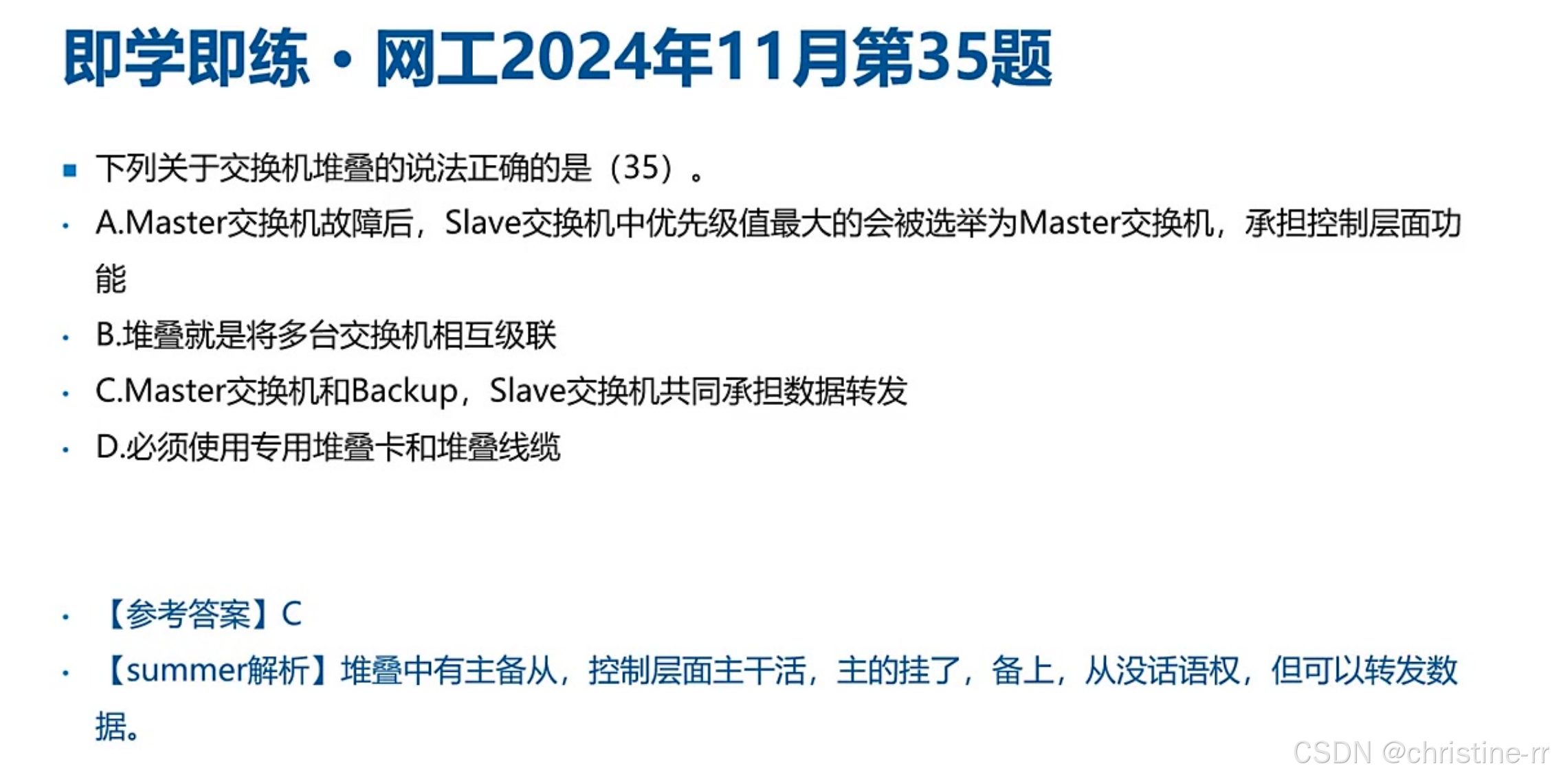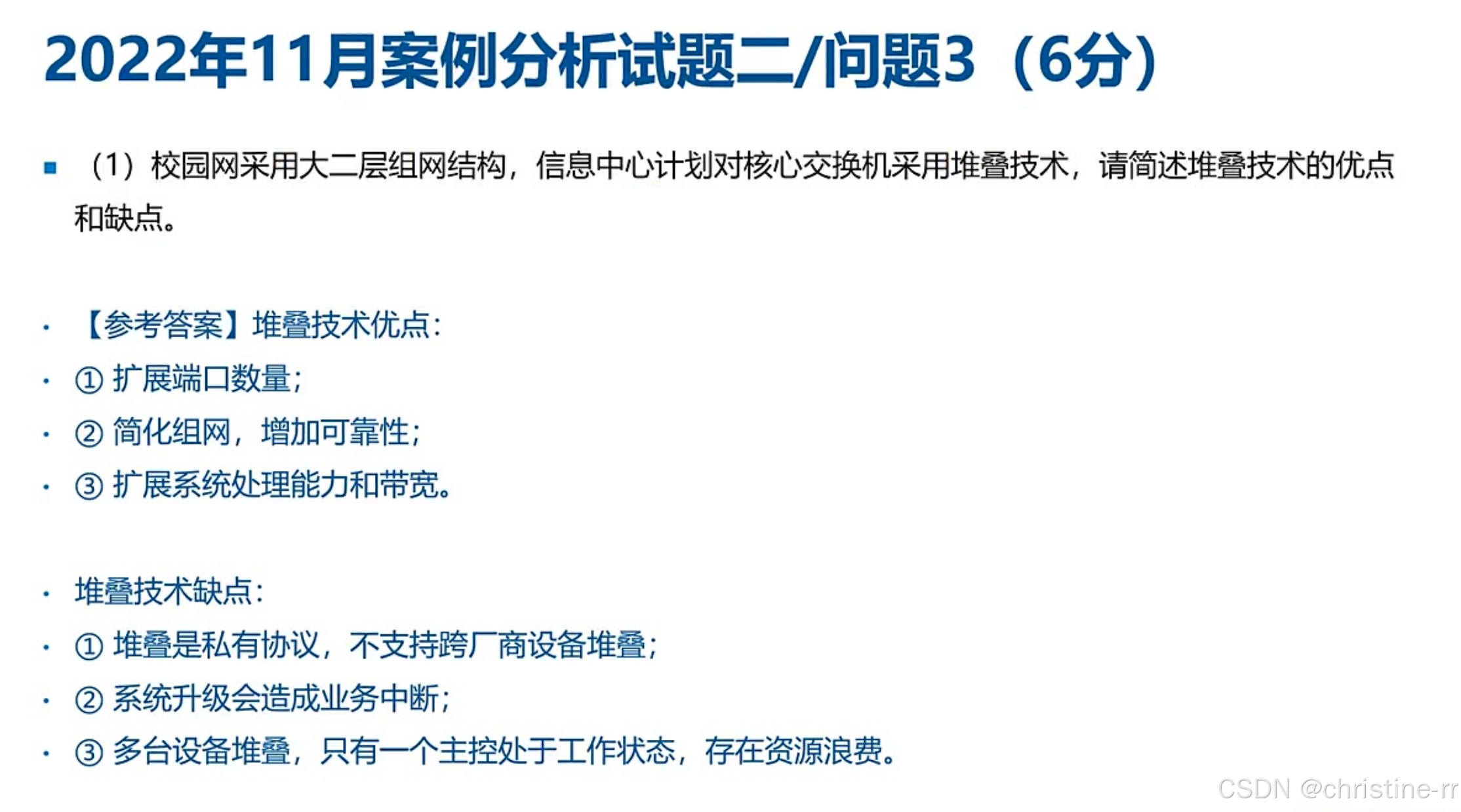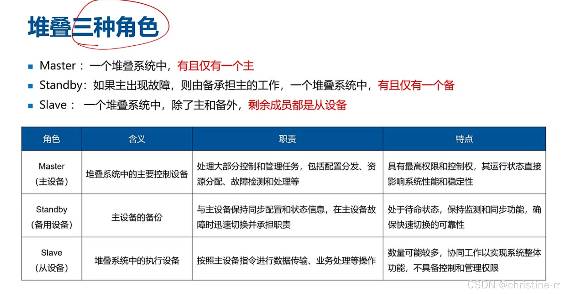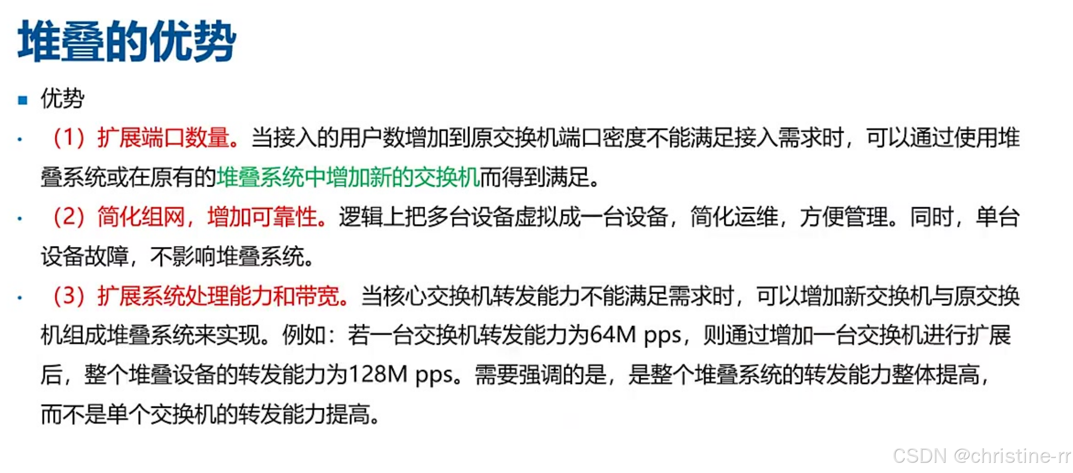 堆叠的优势 | 扩展端口数量、简化组网、提升可靠性等 | 堆叠的核心考点 | 高 |