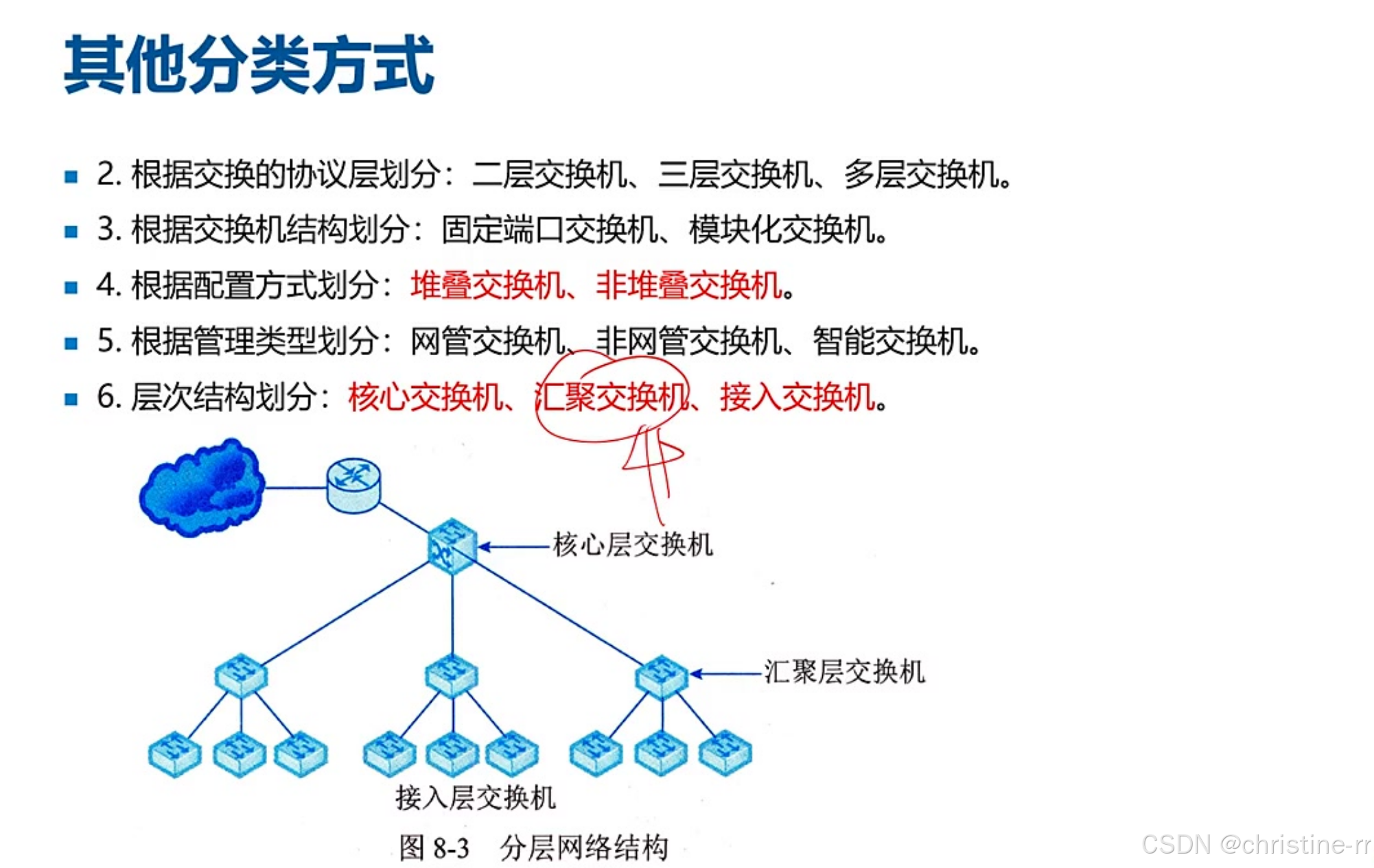交换机分类 | 按交换方式、协议层次、结构、管理类型等分类 | 分类方式及对应类型 | 中 |